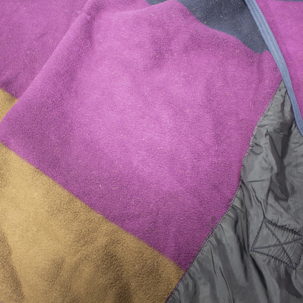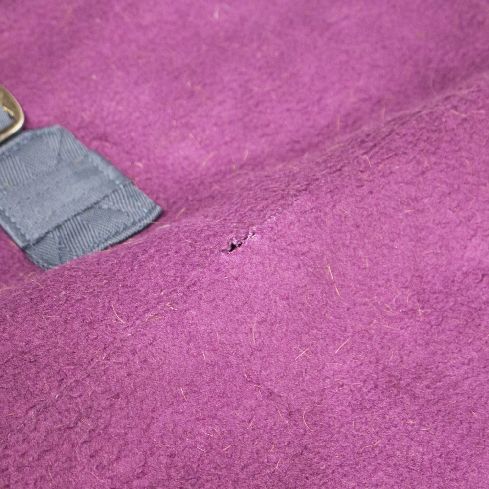 Die Abschwitzdecke hat eine Rückenlänge von 145 cm und ist lila. Die Abschwitzdecke hat Gebrauchsspuren und ein kleines Loch.