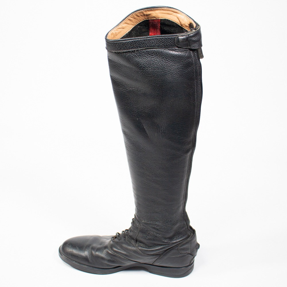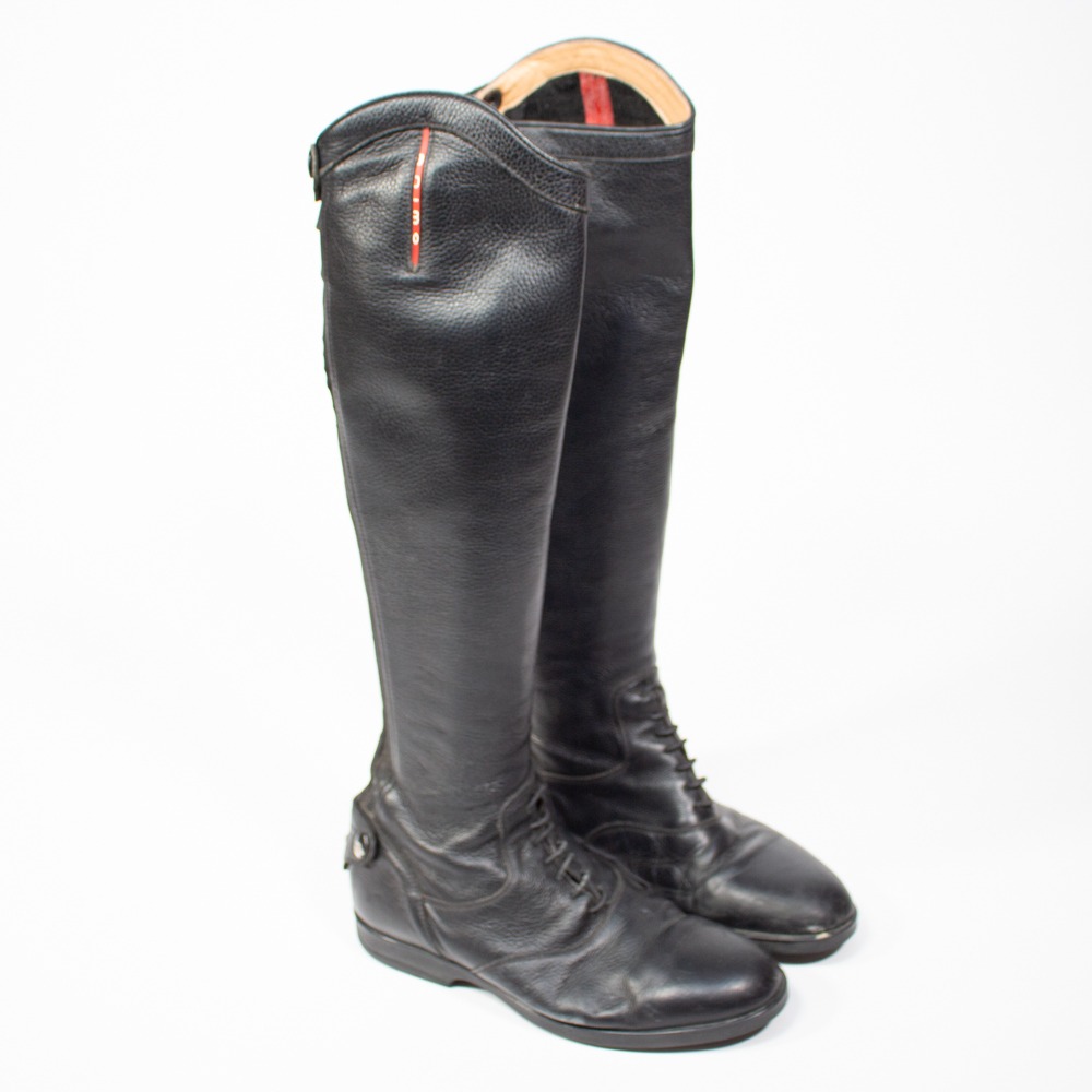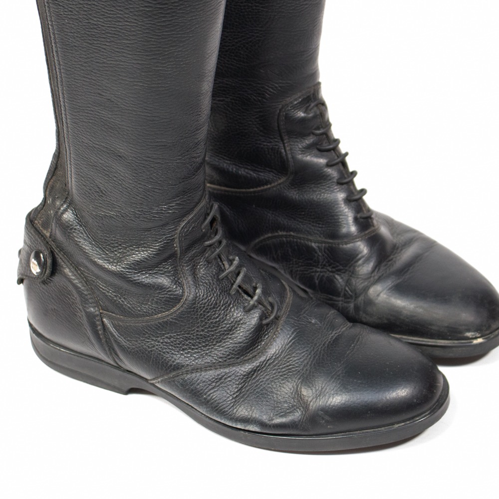 Die Reitstiefel von Animo haben Größe 40, eine Höhe von 46 cm und eine Weite von 36 cm. Schließen lässt er sich mit einem Reißverschluss und zwei Druckknöpfen. Er hat eine Schnürung. Die Stiefel haben leichte Gebrauchsspuren.