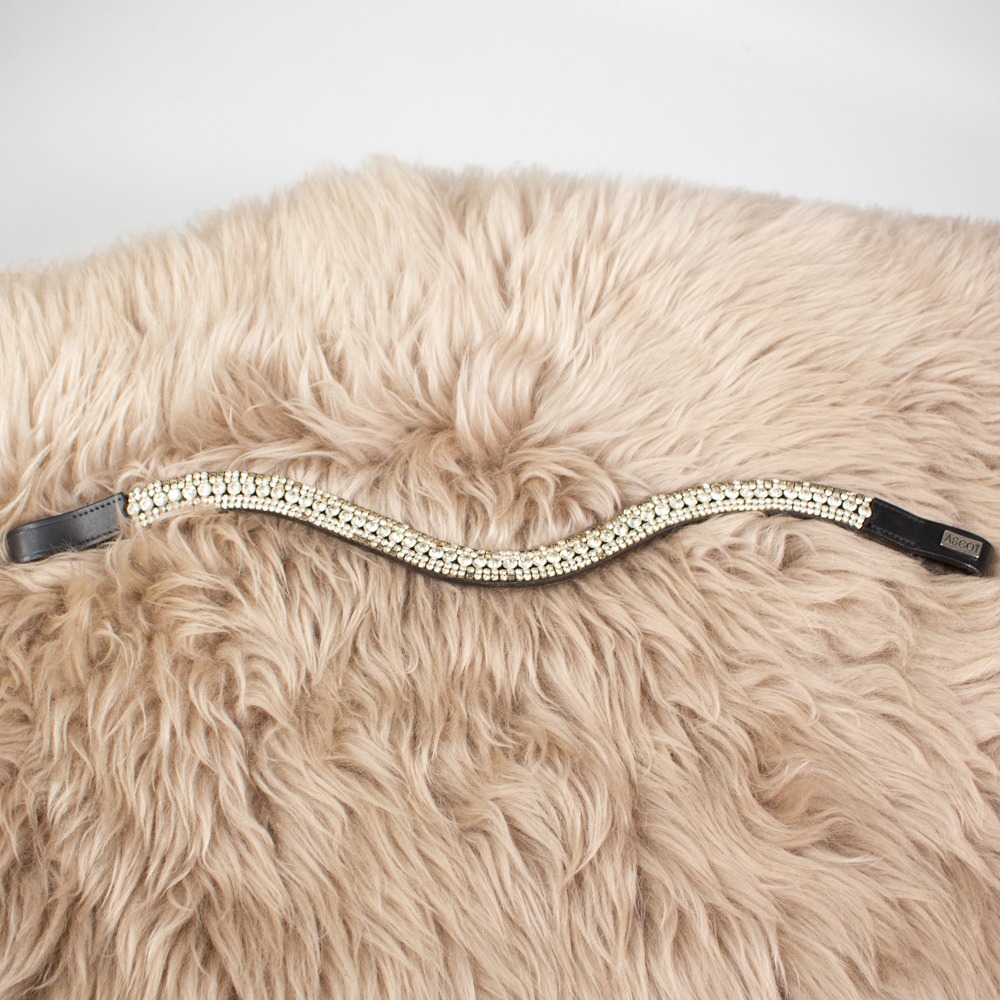 Der Stirnriemen von Ascot ist aus schwarzem Leder gefertigt und geschwungen geschnitten. Das Stirnband hat Größe Warmblut und weiße Glitzersteine. Der Stirnriemen hat leichte Gebrauchsspuren.