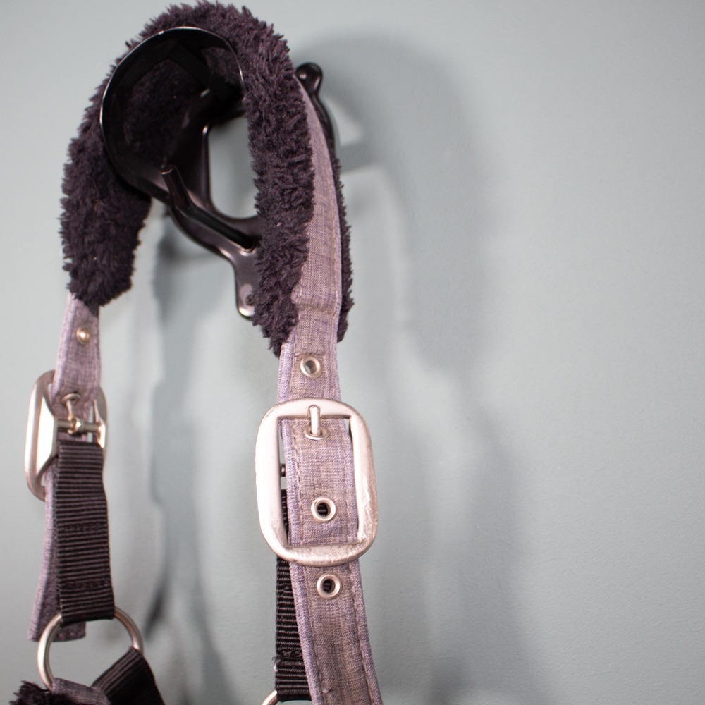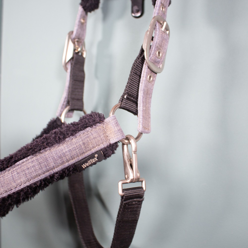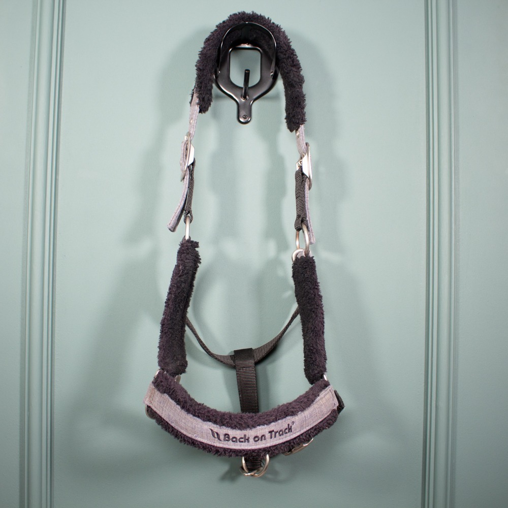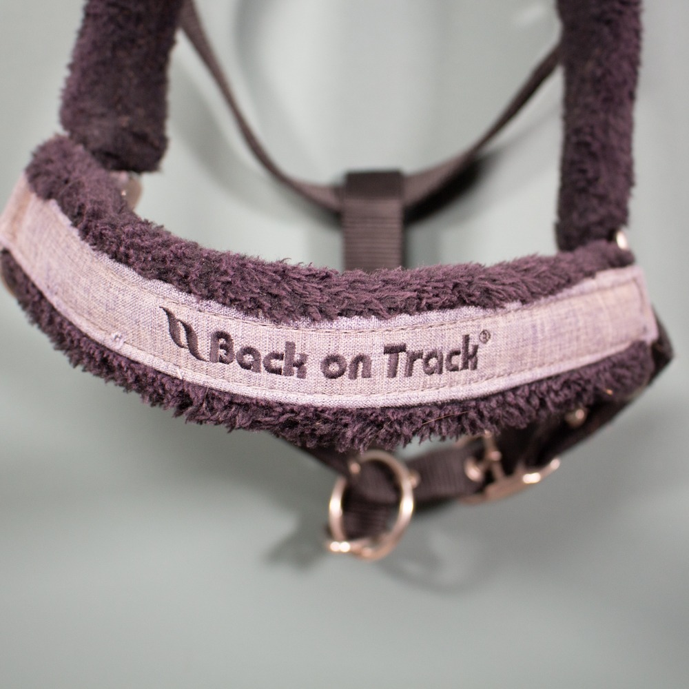 Das Halfter von Back on Track hat silberne Beschläge und ist im Bereich des Genick-, Backen- und Nasenriemens mit Welltex® Fellimitat unterpolstert. Das Halfter ist grau und hat Größe Warmblut. Es hat Gebrauchsspuren.