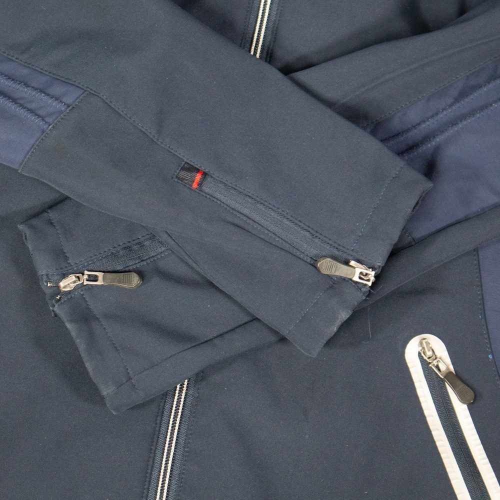 Die Jacke aus Softshell von Black Forest hat zwei Taschen mit Reißverschluss und Größe L. Die dunkelblaue Jacke hat eine Kapuze und ein Fleecefutter. Sie hat leichte Gebrauchsspuren.