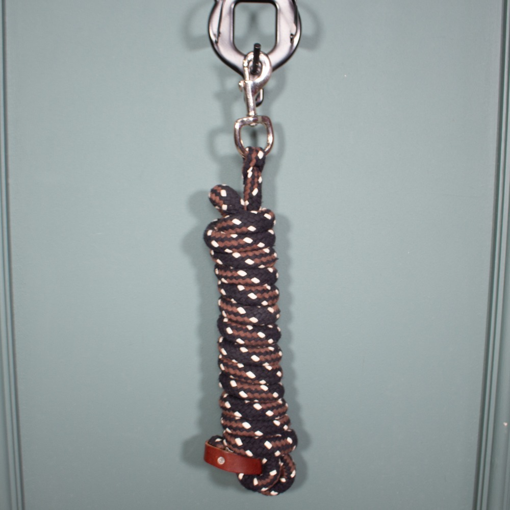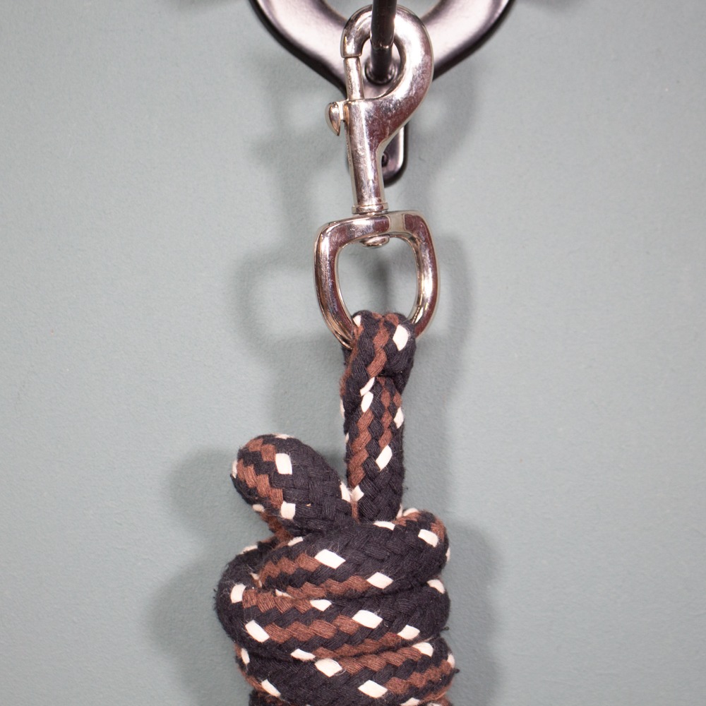 Das Bodenarbeitsseil hat einen silbernen Karabiner und ist schwarz/braun. Das Seil hat leichte Gebrauchsspuren.