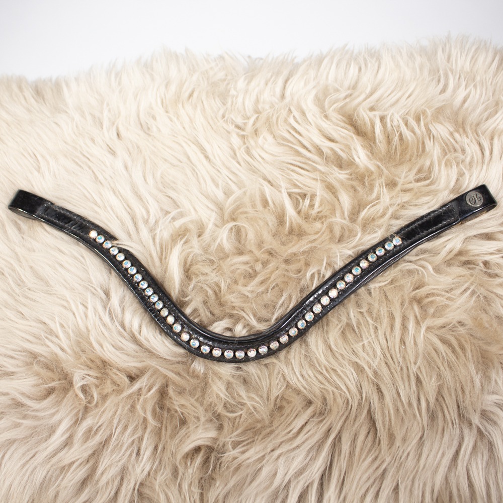 Der Stirnriemen von Claridge House ist aus schwarzem Leder gefertigt und geschwungen geschnitten. Das Stirnband hat Größe Warmblut. Der Stirnriemen hat leichte Gebrauchsspuren.