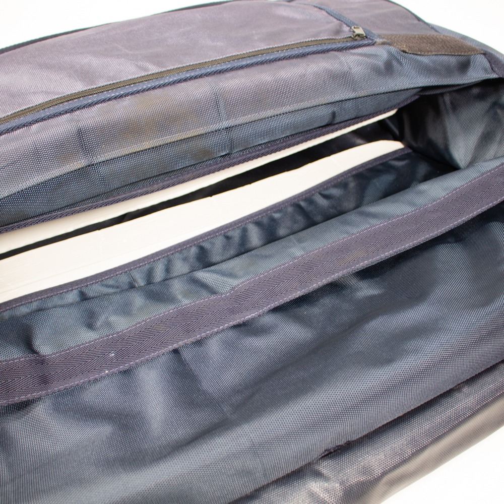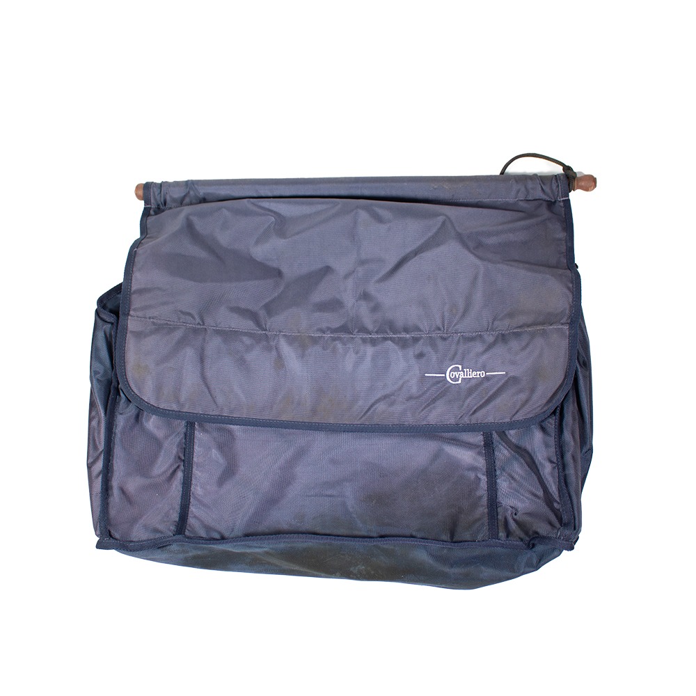 Die Boxentasche von Covalliero ist dunkelblau. Sie hat Gebrauchsspuren.