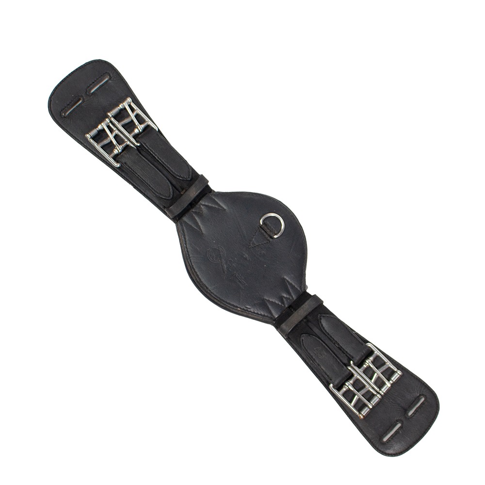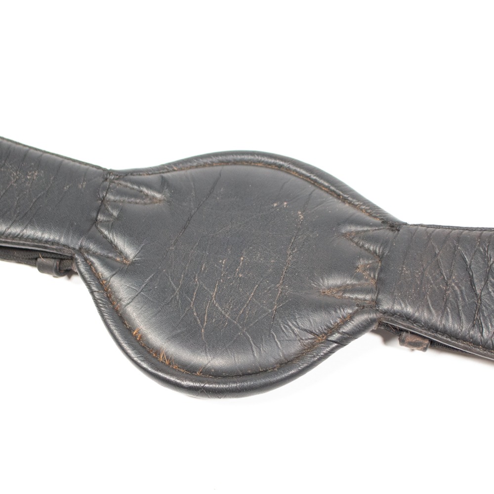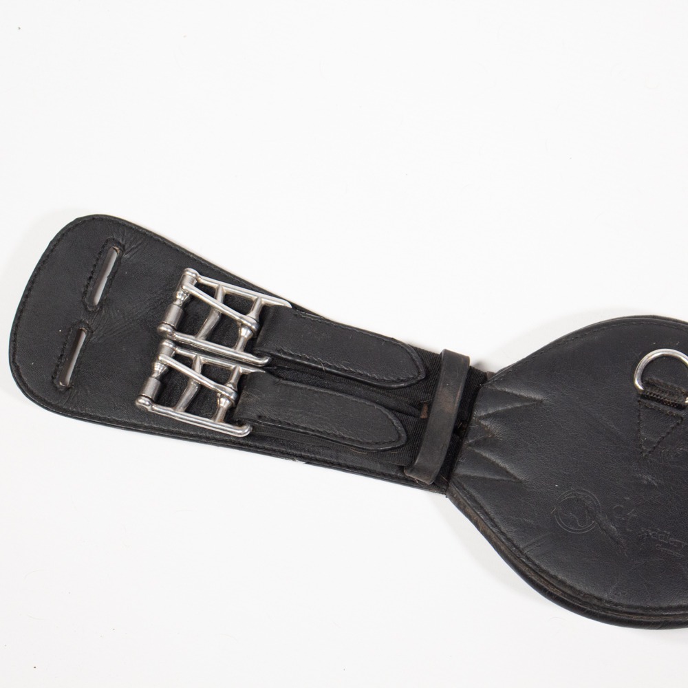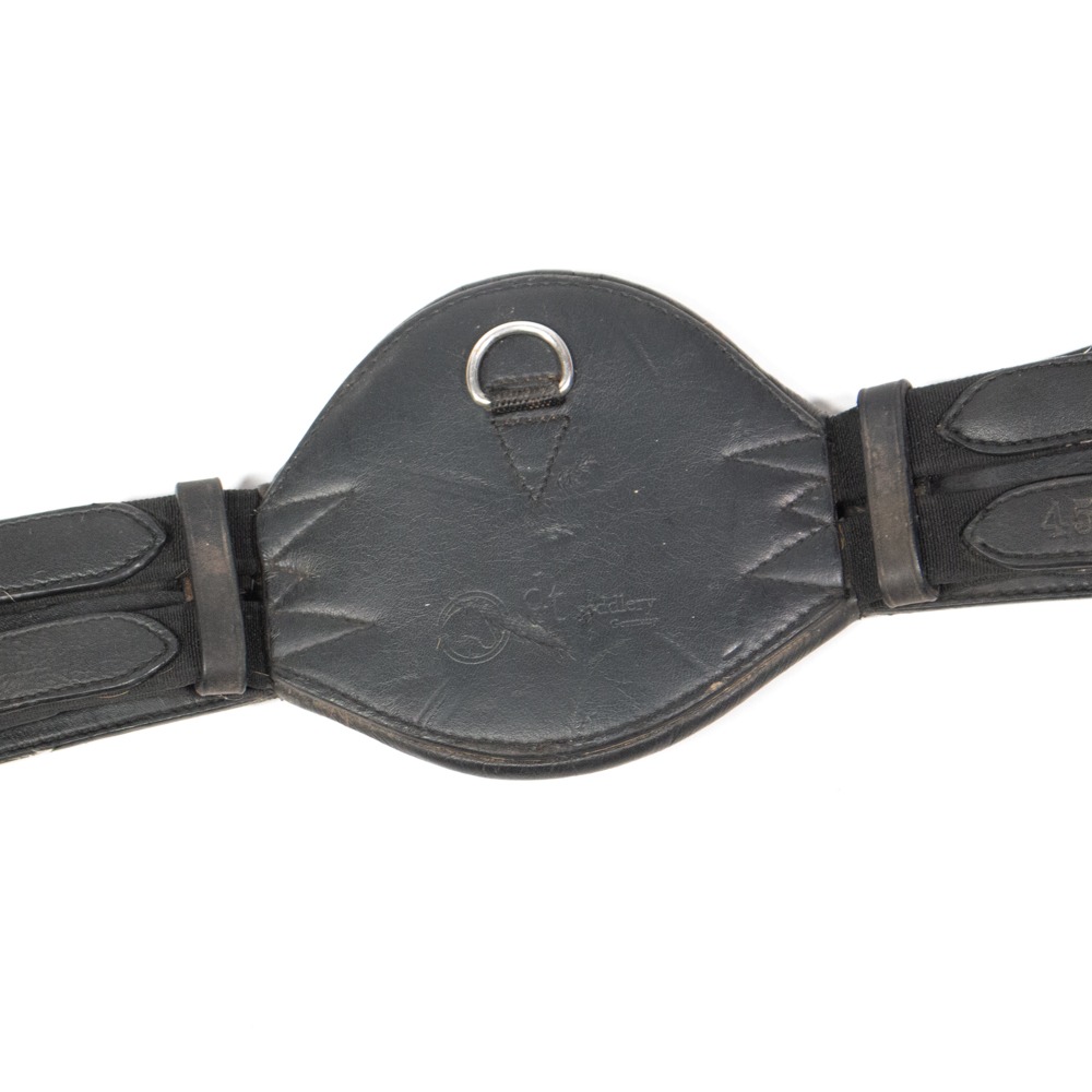 Der Sattelgurt von dt saddlery ist aus Leder gefertigt und anatomisch geformt. Der Gurt ist 45 cm lang und hat beidseitige Elastikeinsätze. Der Sattelgurt hat Gebrauchsspuren.