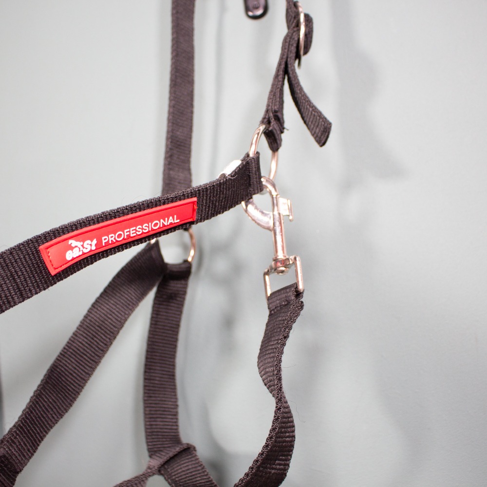 Das Halfter von eaSt ist verstellbar am Genickriemen und hat Größe Warmblut. Das schwarze Halfter hat silberne Beschläge. Es hat leichte Gebrauchsspuren.