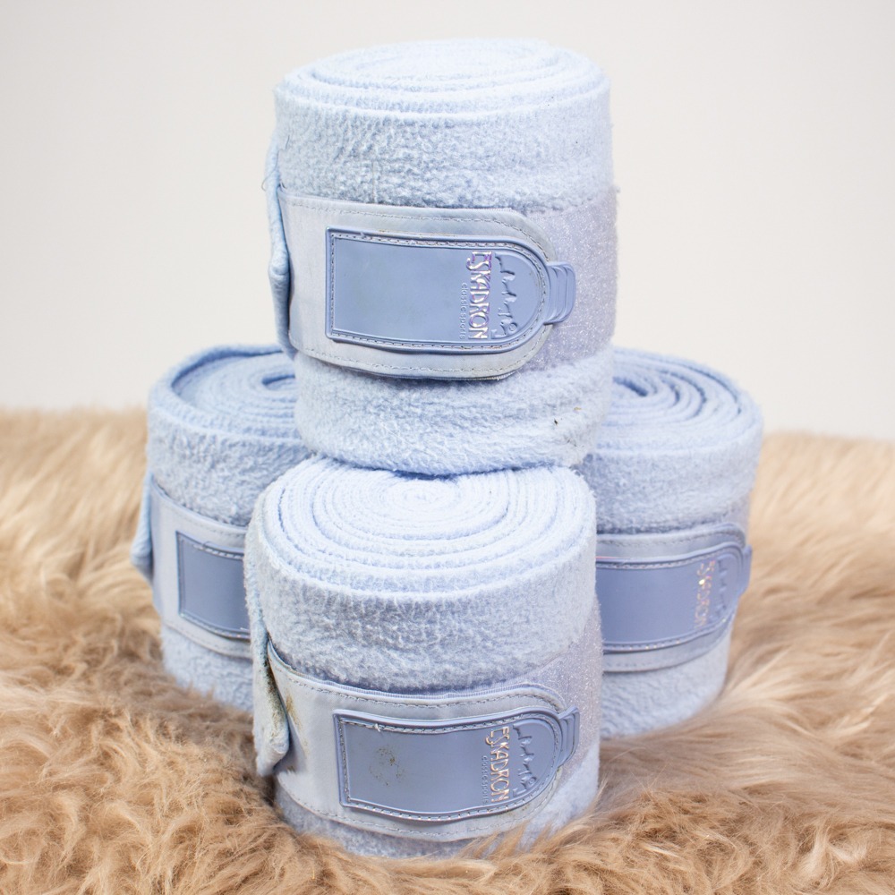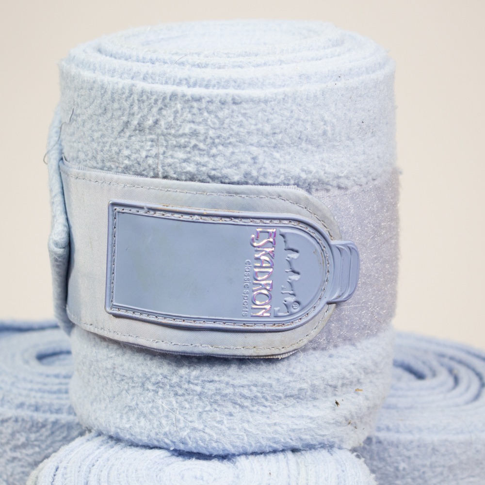 Die Eskadron Bandagen in Größe Warmblut und der Farbe skyblue kommen im 4er Set. Die Bandagen sind aus der Classic Sports Kollektion von Frühjahr/Sommer 2020. Die Bandagen haben Gebrauchsspuren.