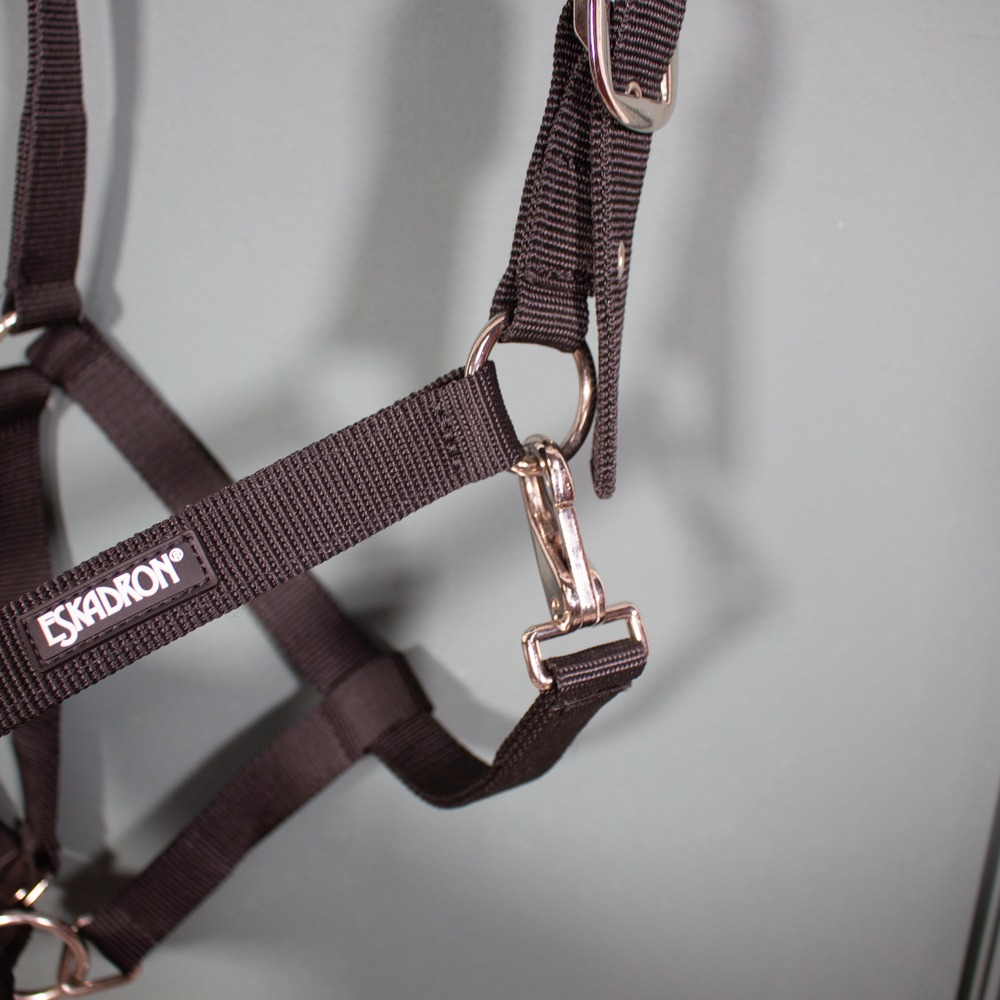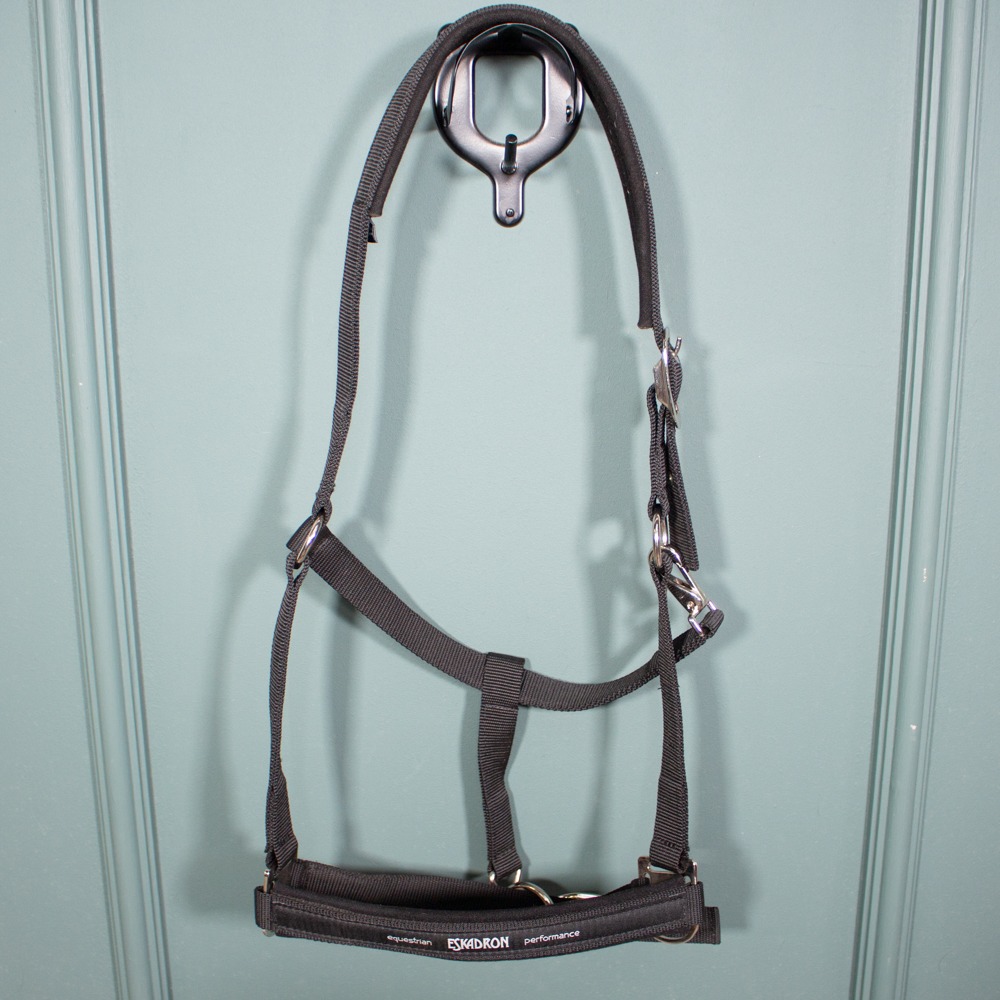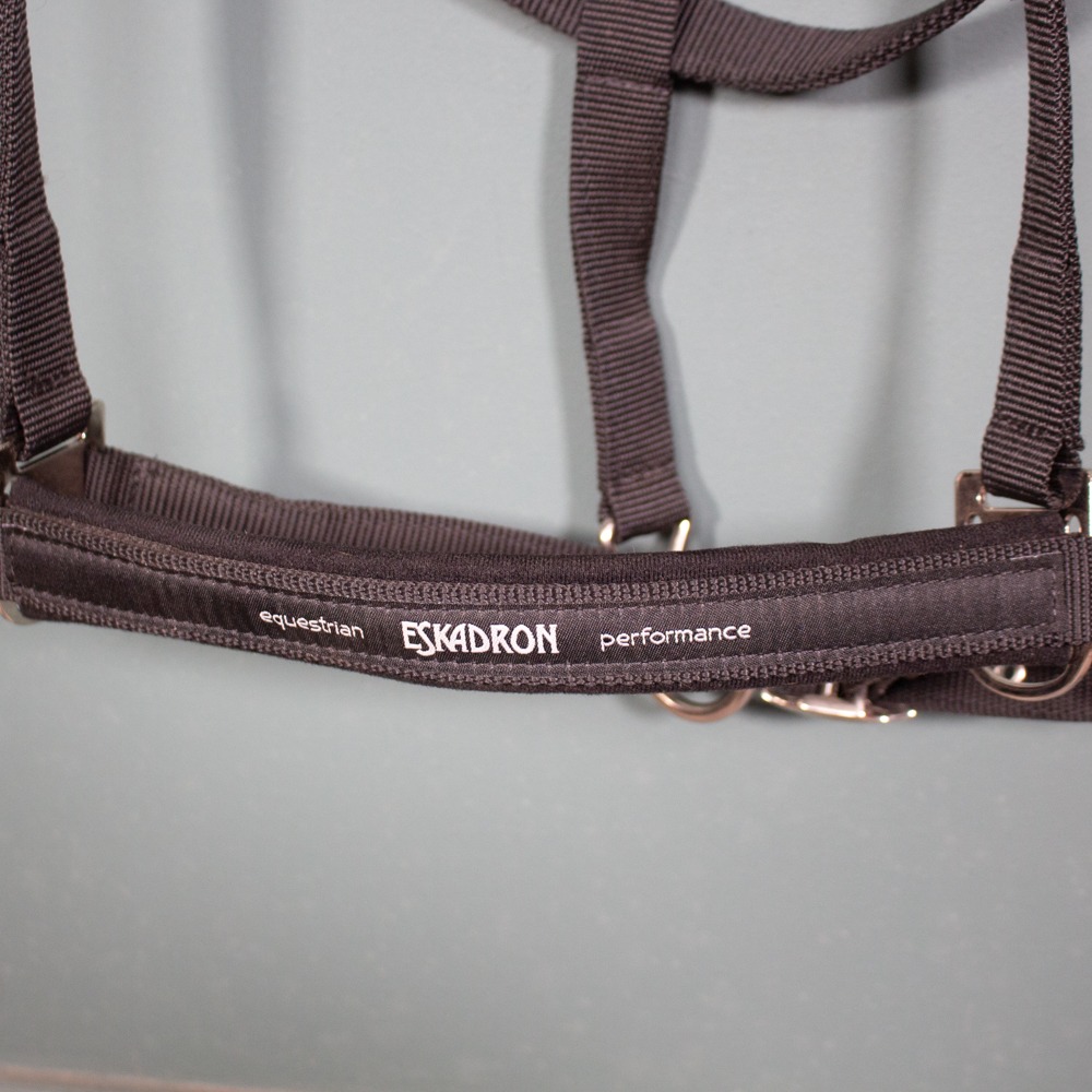 Das Halfter von Eskadron ist verstellbar am Nasen- & Genickriemen. Es hat Größe XFull und die Farbe black. Das Halfter ist so gut wie neu.