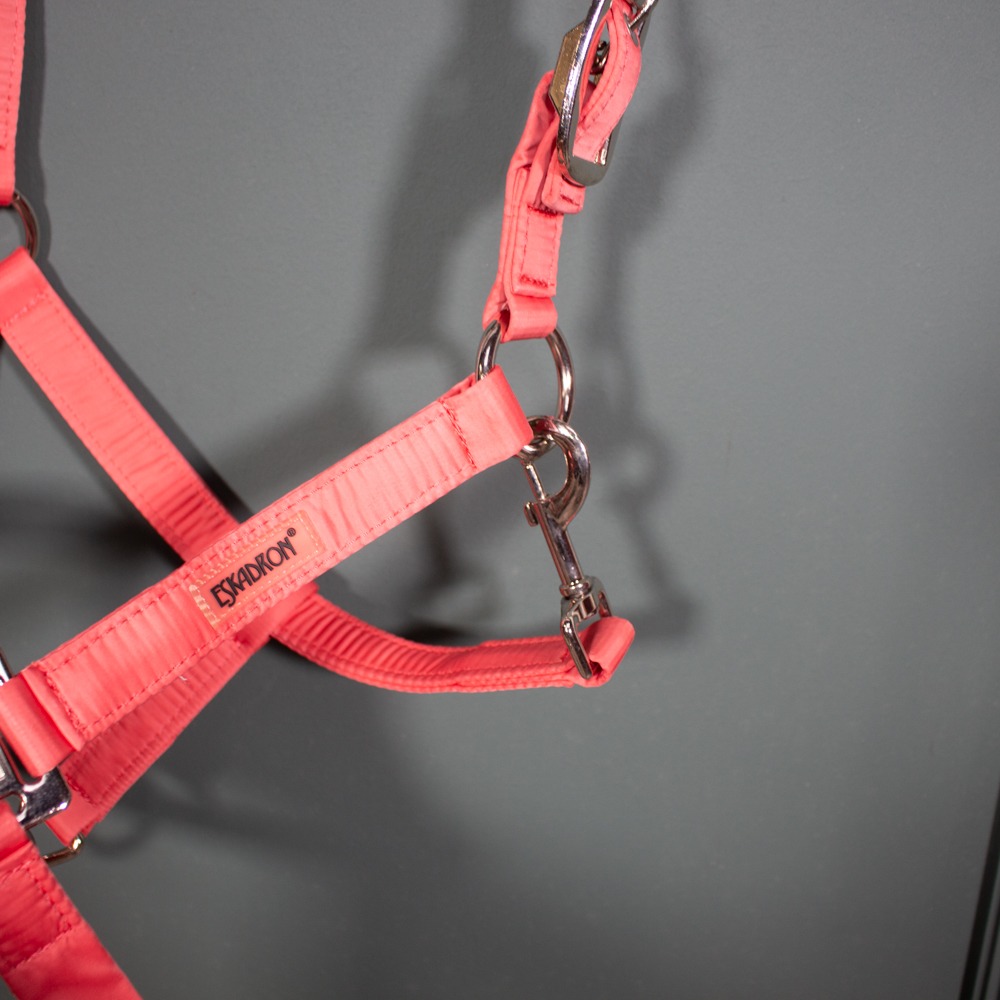 Das Halfter von Eskadron ist verstellbar am Nasen- & Genickriemen. Es hat Größe Warmblut und die Farbe fusion coral. Es stammt aus der Classic Sports Kollektion von Frühjahr/Sommer 2019. Das Halfter ist so gut wie neu.