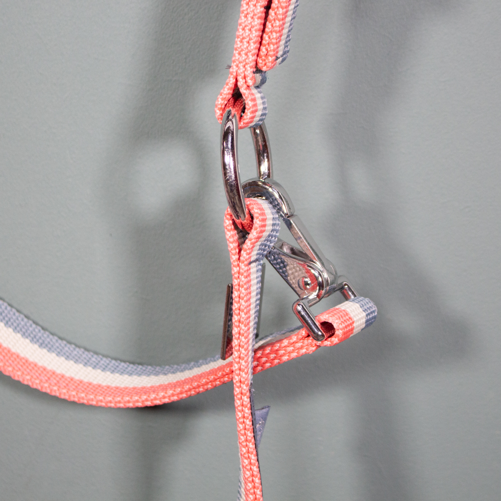 Das Halfter von Eskadron hat Größe Warmblut und die Farbe steel blue/greige/coral blossom. Es stammt aus der Classic Sports Kollektion von Frühjahr/Sommer 2025. Das Halfter ist neu.