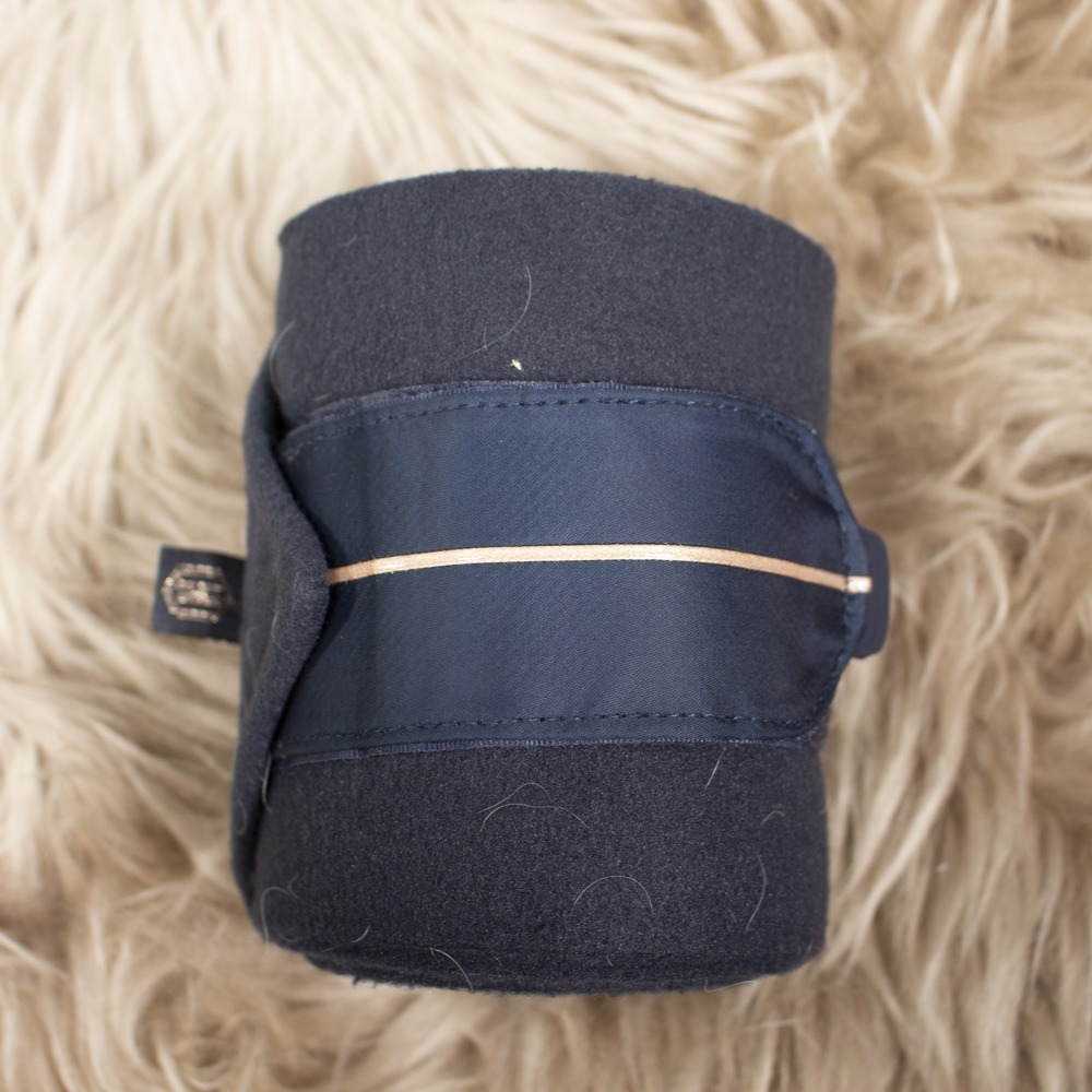Die Bandagen von Eskadron in Größe Warmblut und der Farbe navy kommen im 4er Set und sind aus der Heritage Kollektion von Herbst/Winter 2021. Die Bandagen haben leichte Gebrauchsspuren und wurden gekürzt.