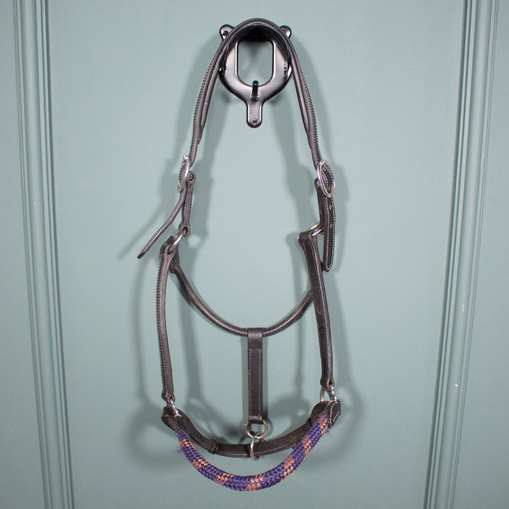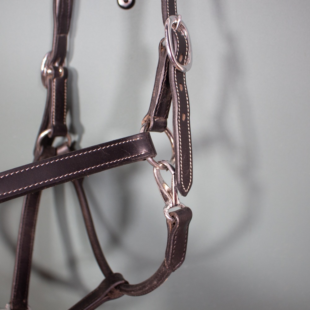 Das Lederhalfter von Euroriding ist schwarz und verstellbar am Nasen- und Genickriemen. Es hat Größe Warmblut und ist schwarz mit silbernen Beschlägen. Das Halfter hat leichte Gebrauchsspuren.