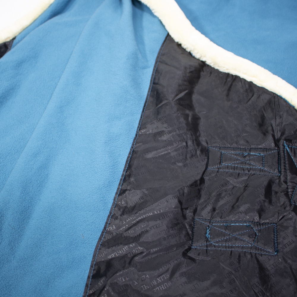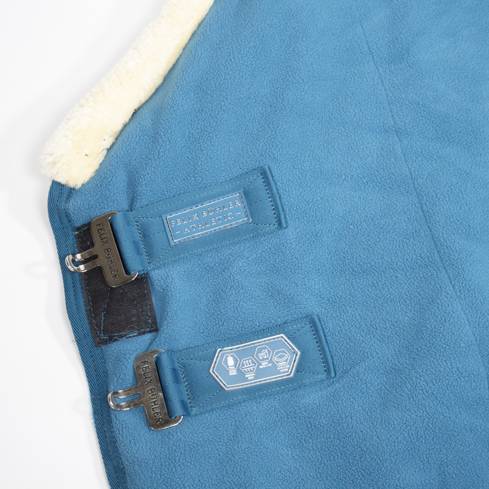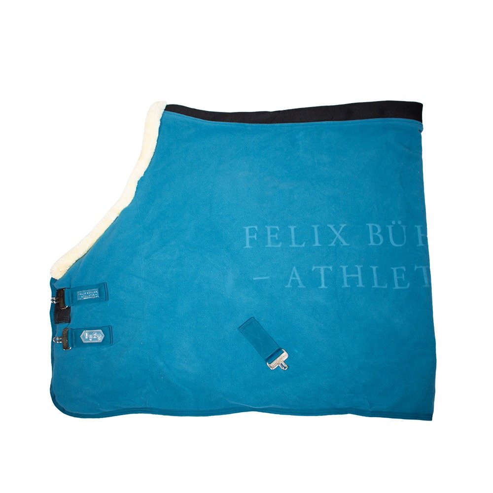 Die Abschwitzdecke von Felix Bühler hat eine Rückenlänge von 155 cm und ist türkis. Sie hat eine abnehmbare Kreuzbegurtung. Die Bauchgurte fehlen. Die Abschwitzdecke hat leichte Gebrauchsspuren.