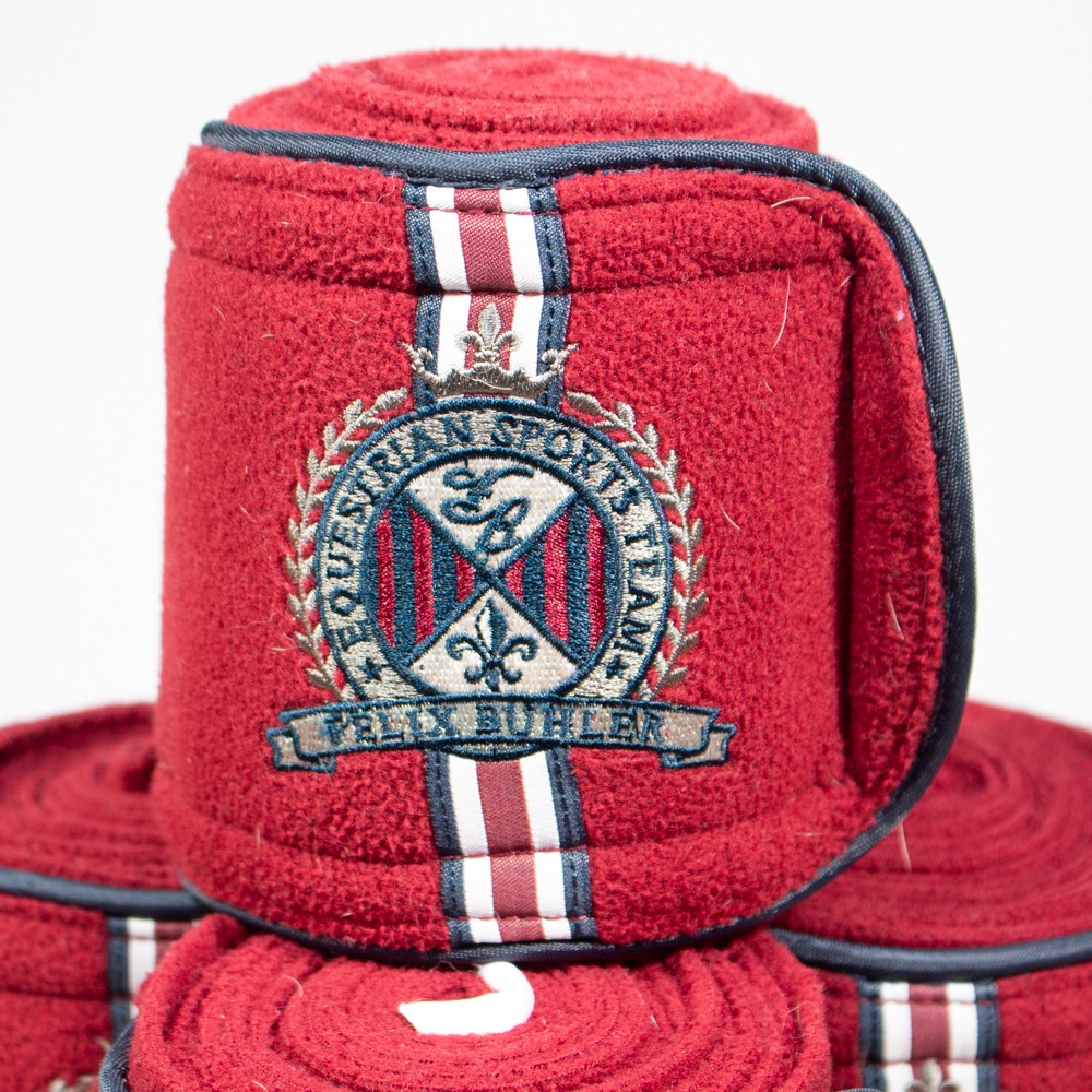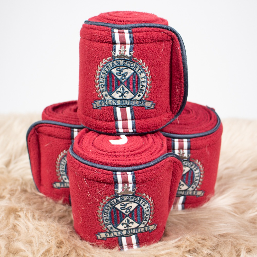 Die Bandagen von Felix Bühler haben Größe Warmblut und sind rot. Sie kommen im 4er Set. Die Bandagen haben leichte Gebrauchsspuren.