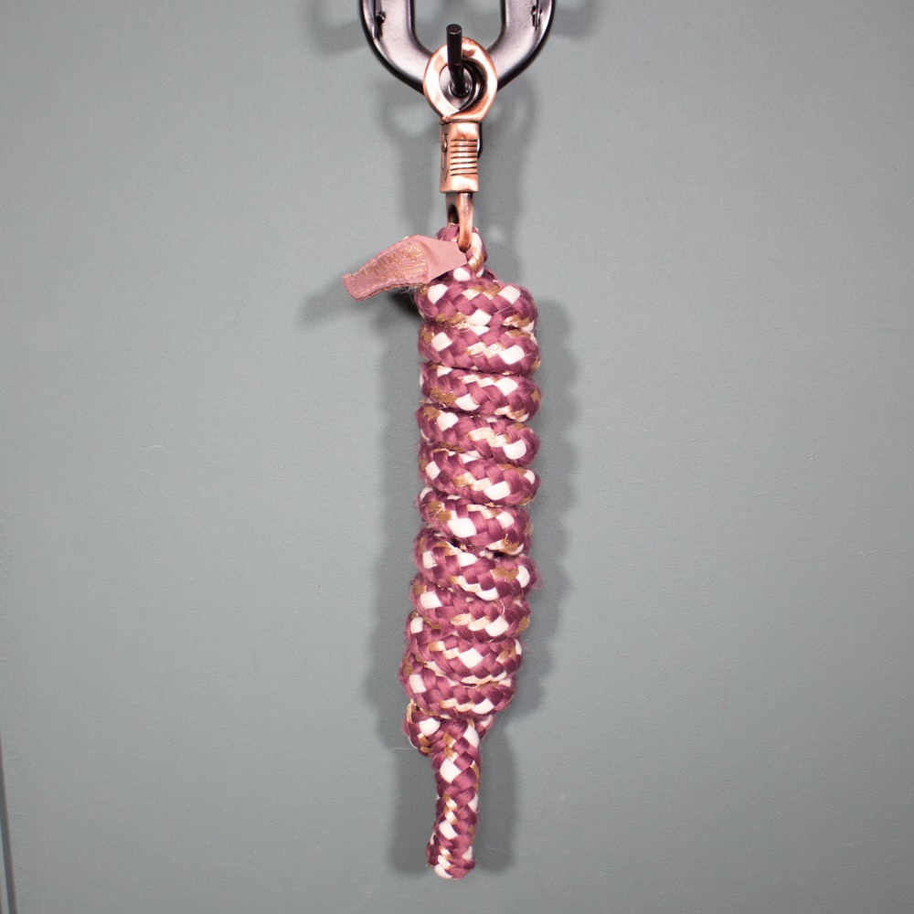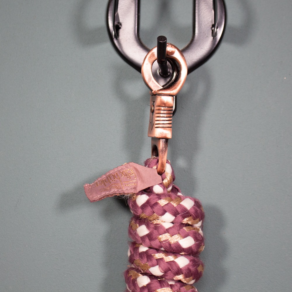 Der Führstrick von Felix Bühler hat einen roségoldenen Panikhaken und ist rosa. Er hat leichte Gebrauchsspuren.