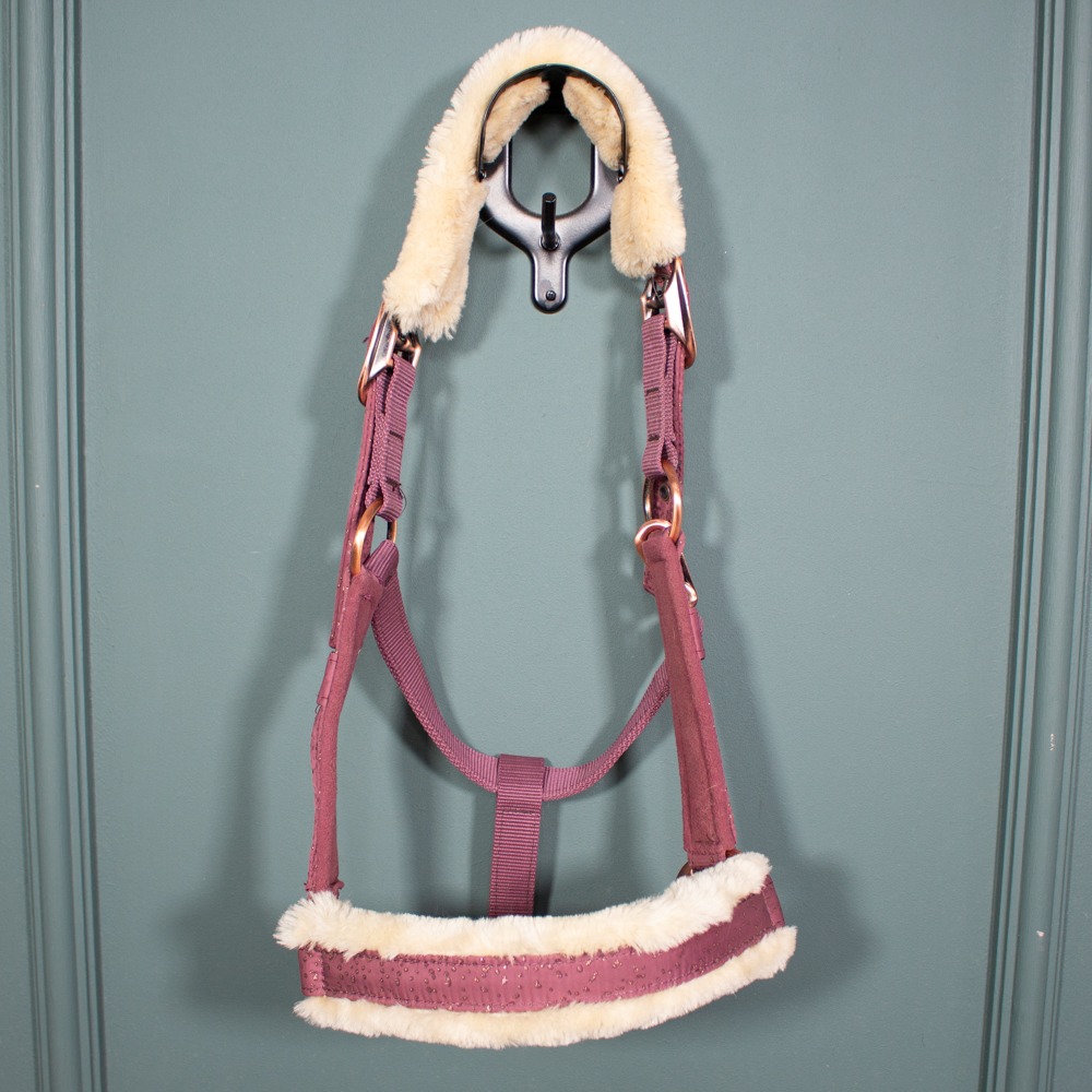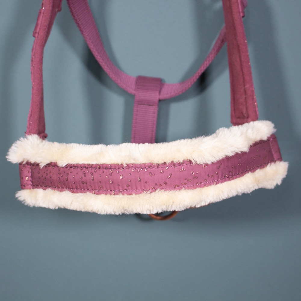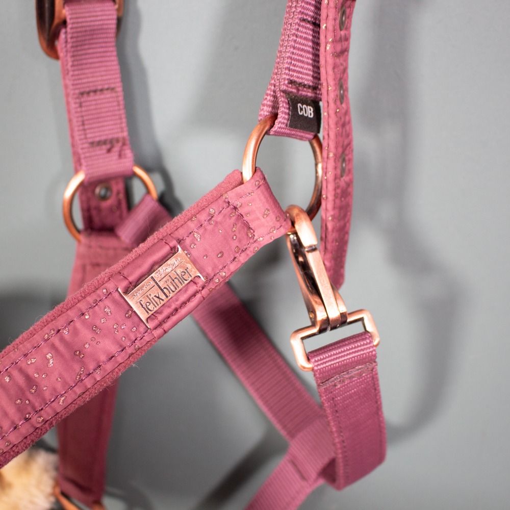 Das Halfter von Felix Bühler ist verstellbar am Nasen- & Genickriemen und hat Größe COB. Das Halfter hat roségoldene Beschläge und ist mit Kunstfell unterlegt. Es hat leichte Gebrauchsspuren.