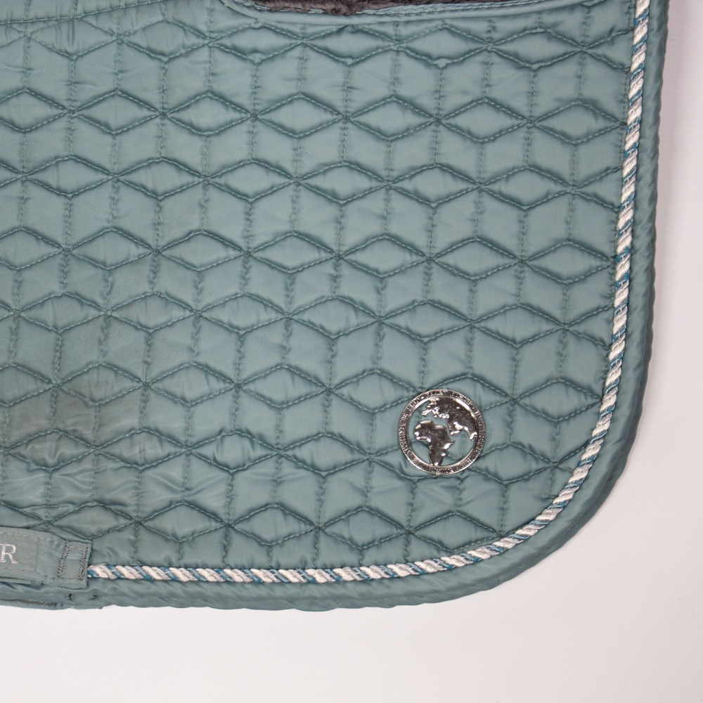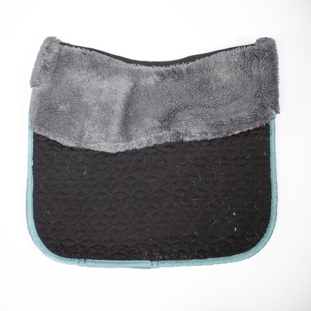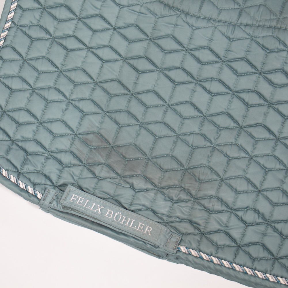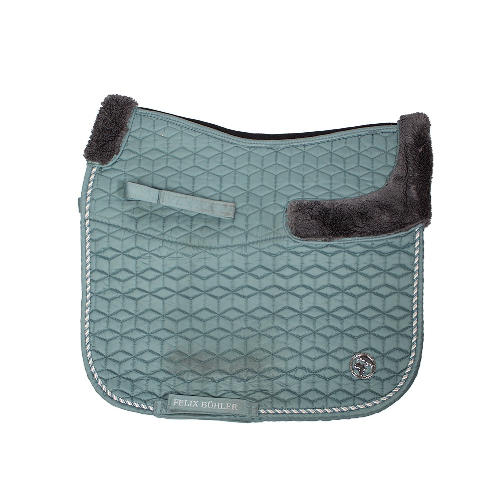Die Schabracke von Felix Bühler ist dunkelgrün und hat eine Kunstfell und Mesh Unterseite. Die Schabracke hat leichte Gebrauchsspuren.