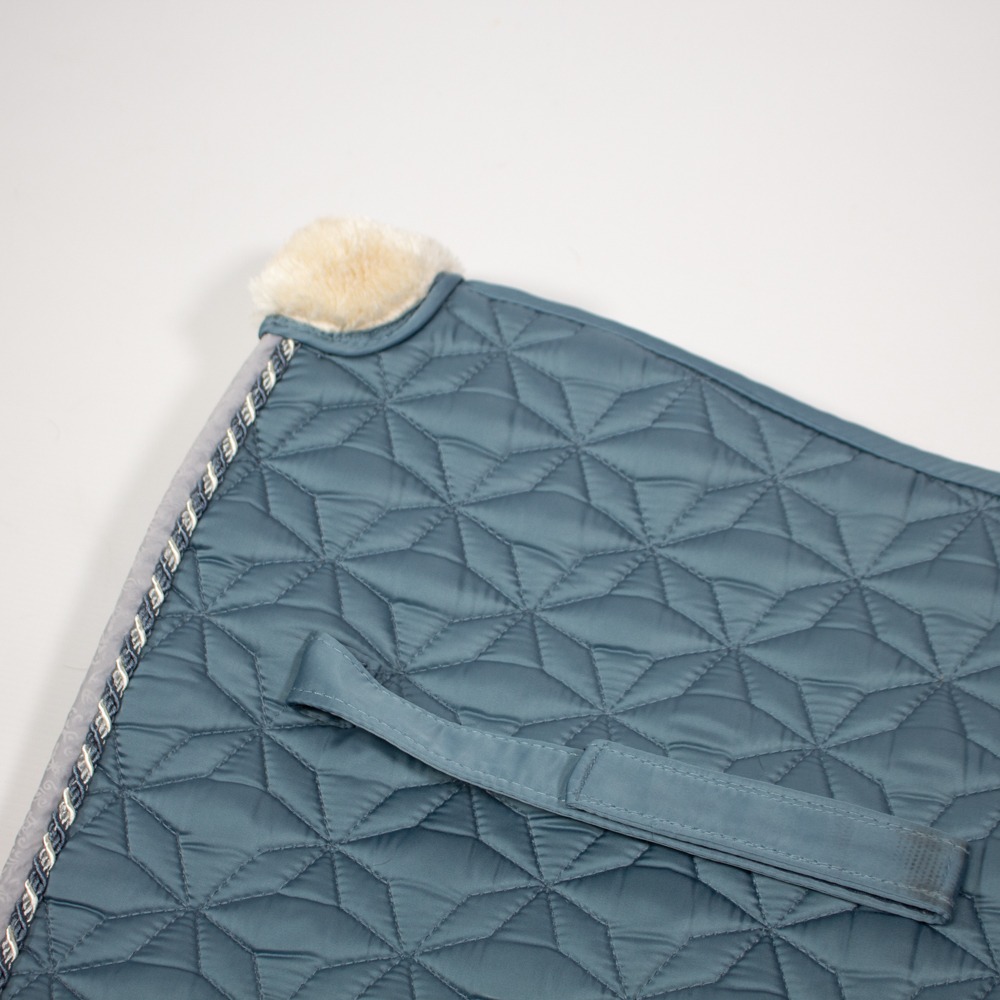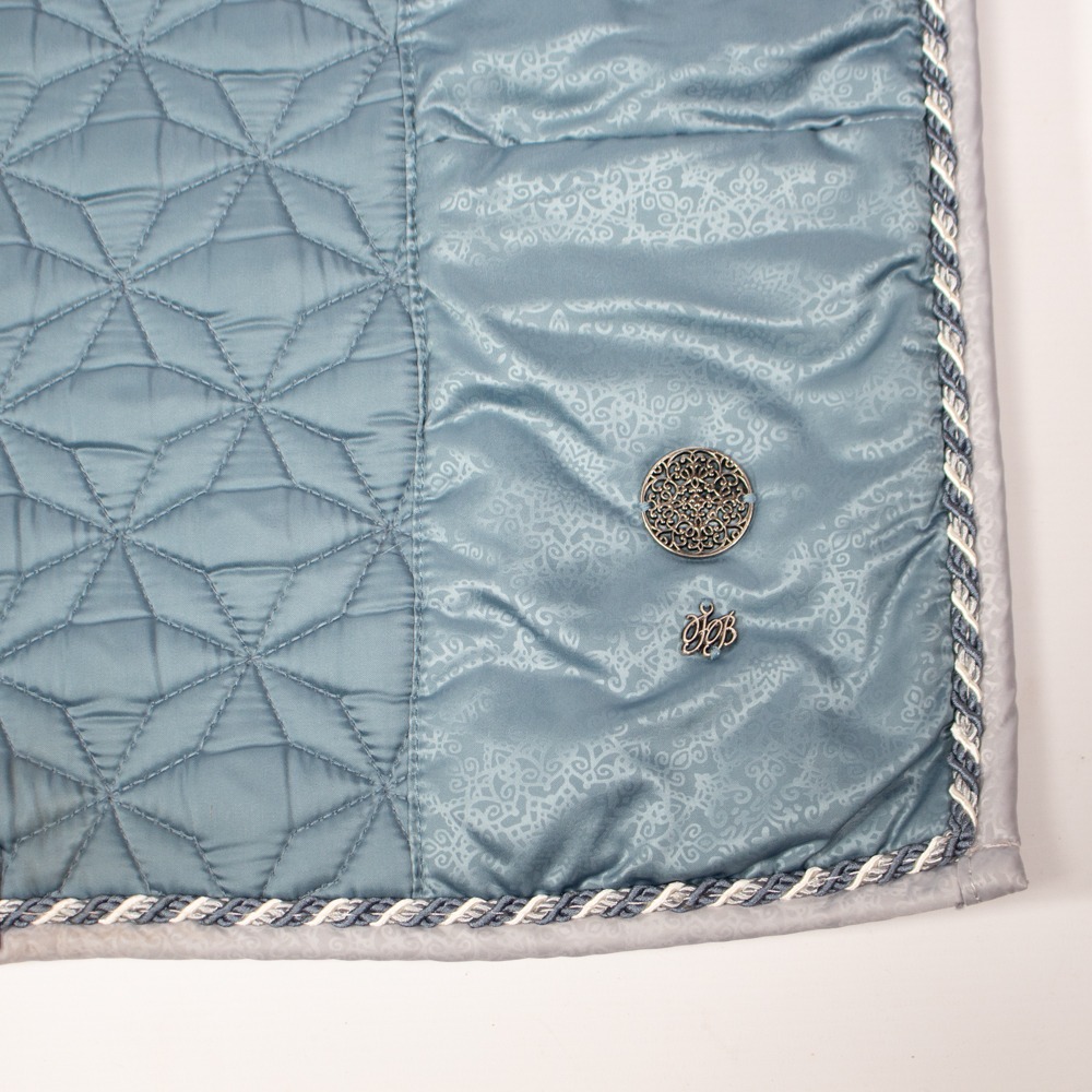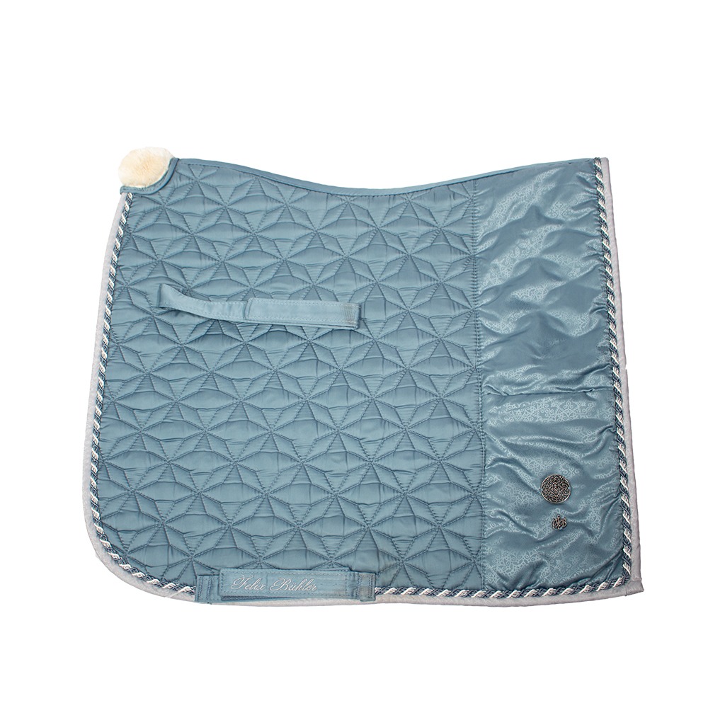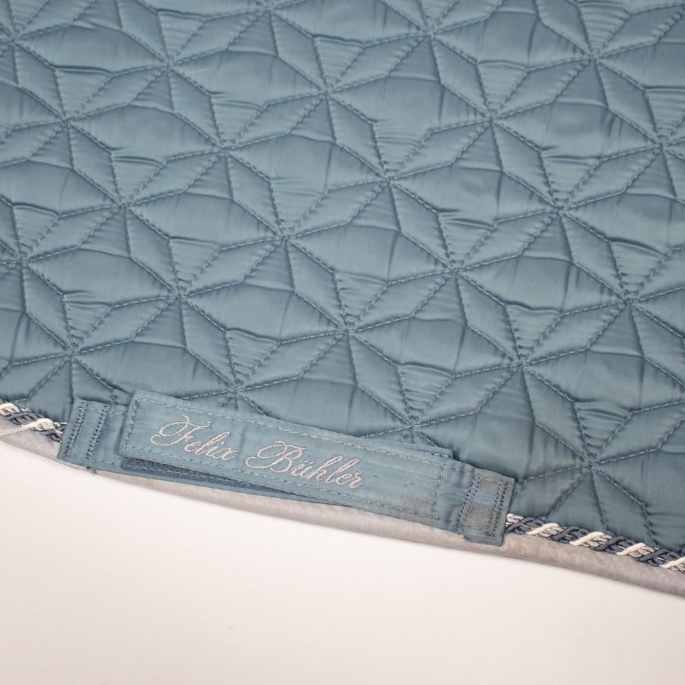 Die Schabracke von Felix Bühler ist hellblau und hat eine mittlere Steppung. Sie hat eine Mesh Unterseite. Die Schabracke hat leichte Gebrauchsspuren.