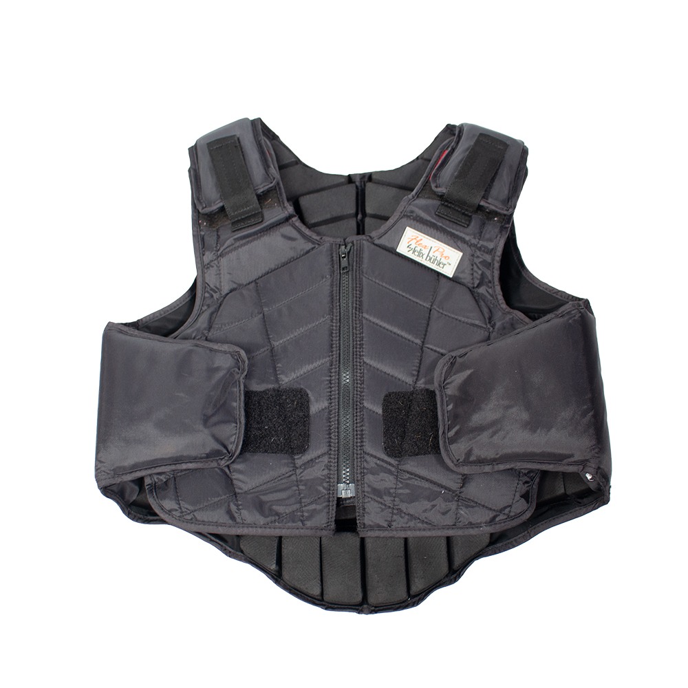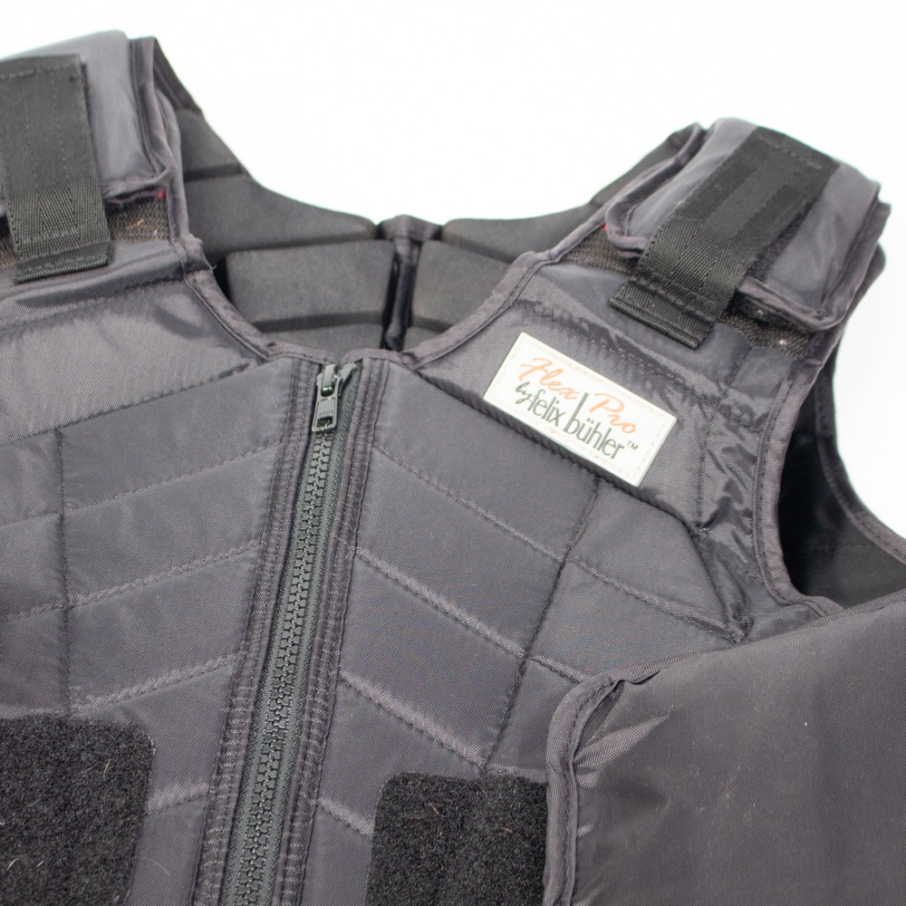 Die Sicherheitsweste von Felix Bühler hat Kindergröße L und eignet sich damit für ein Brustmaß von 80-86 cm und ein Taillenmaß von 78-86 cm. Sie ist schwarz und ist stufenlos einstellbar. Sie ist Level 3. Die Weste hat leichte Gebrauchsspuren.
