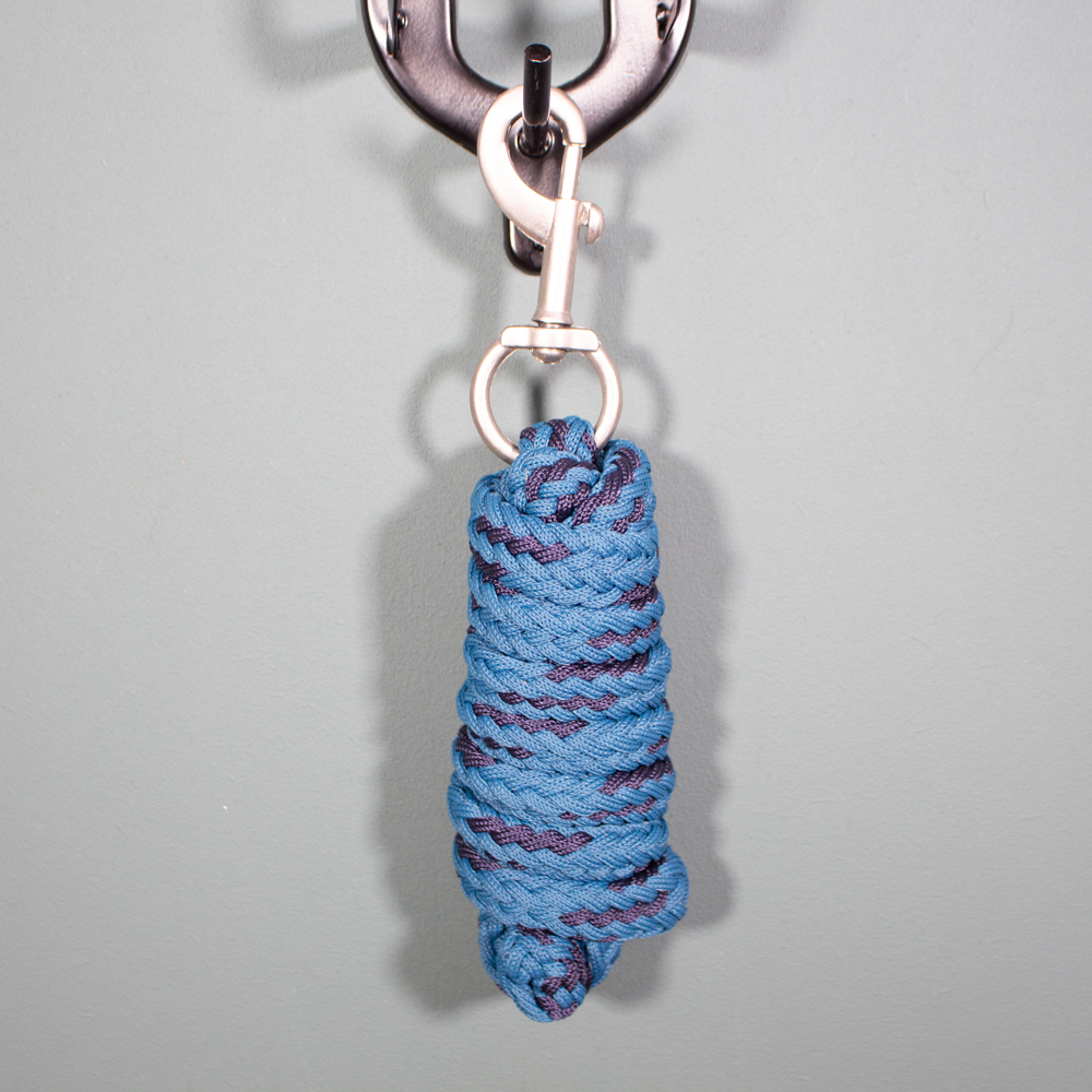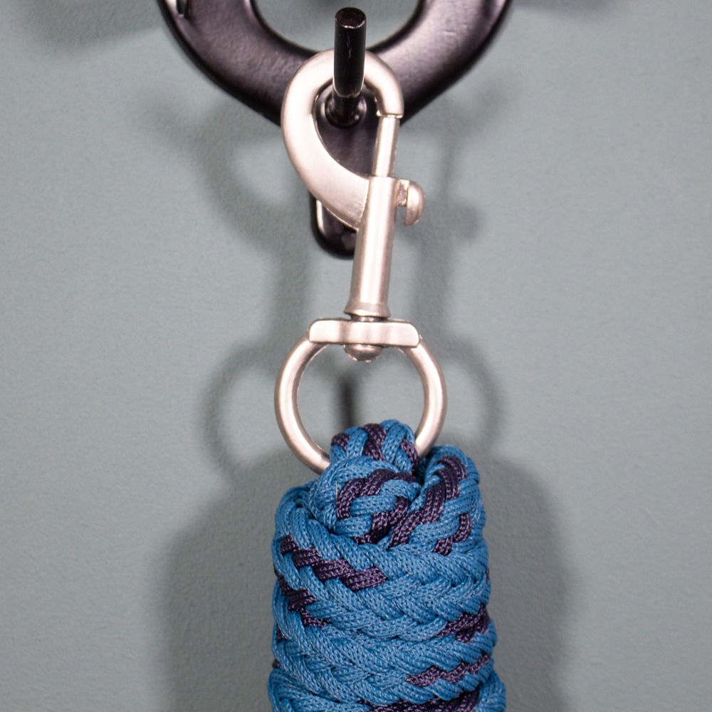 Der Führstrick ist petrol und hat einen silbernen Karabiner. Er hat leichte Gebrauchsspuren.
