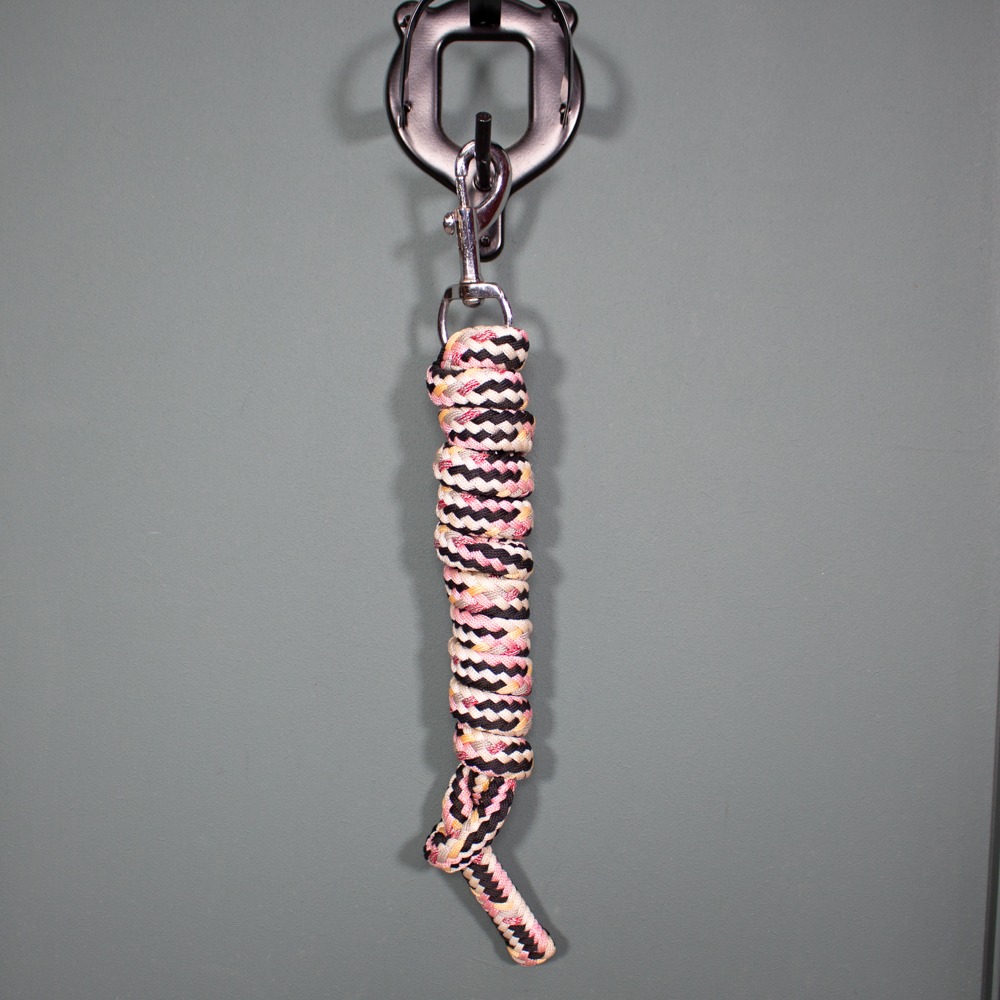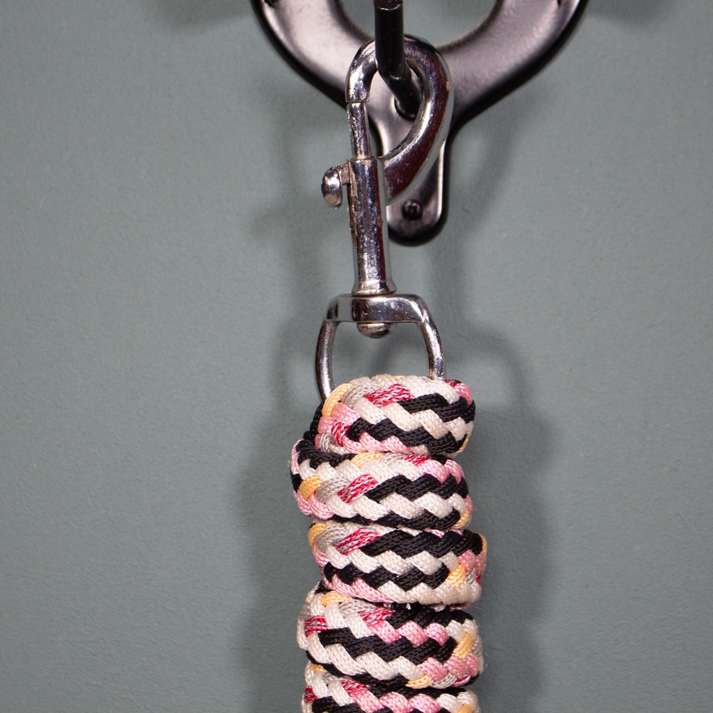 Der Führstrick ist rosa und hat einen silbernen Karabiner. Er hat leichte Gebrauchsspuren.
