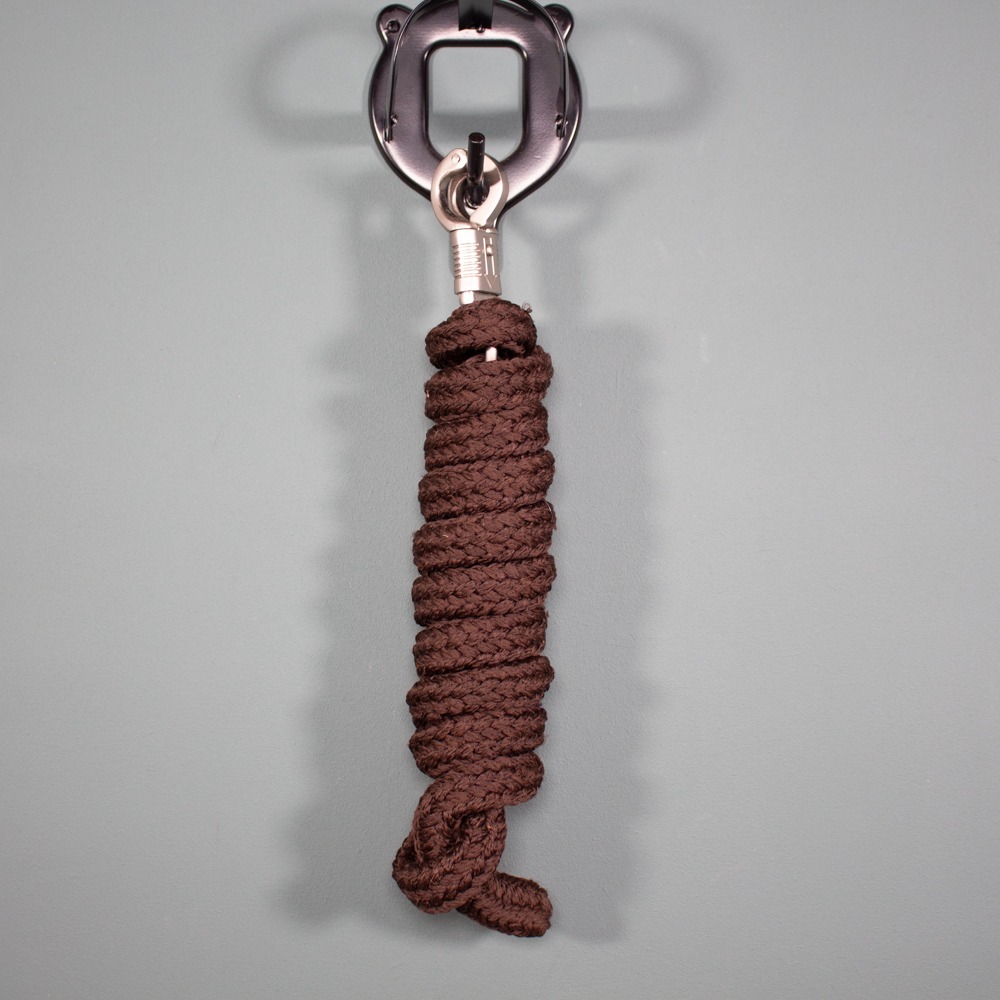 Der Führstrick hat einen silbernen Panikhaken und ist braun. Er hat leichte Gebrauchsspuren.