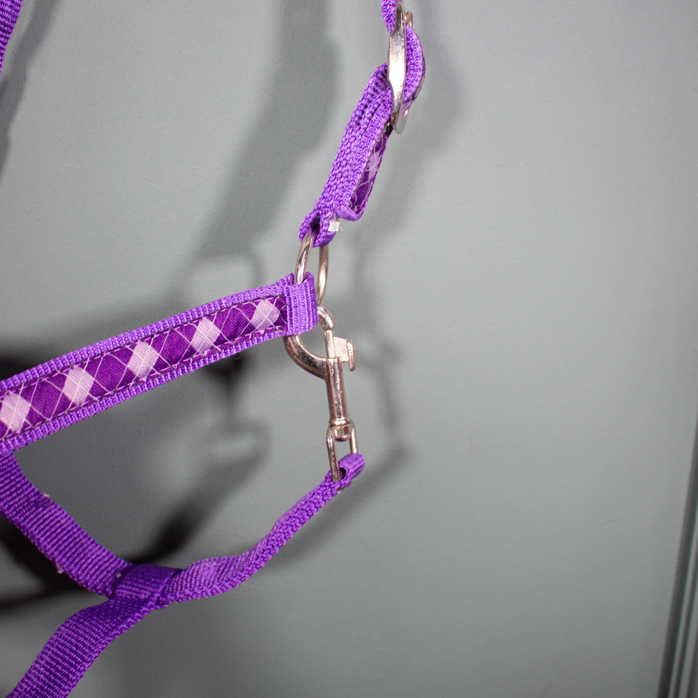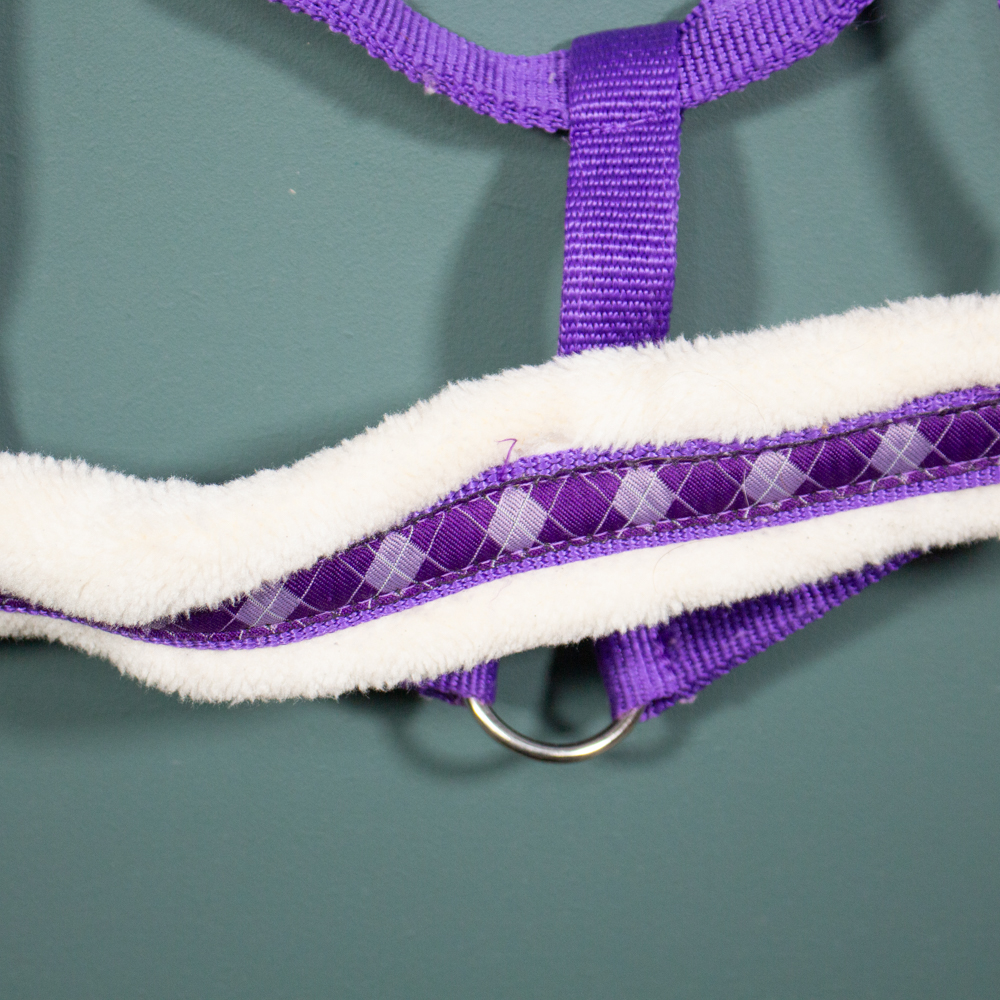Das Halfter ist lila und hat Größe Warmblut. Es hat leichte Gebrauchsspuren.