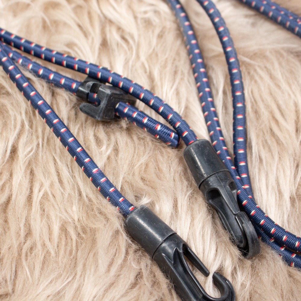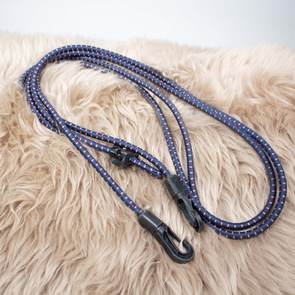 Die Halsverlängerer sind voll elastisch und stufenlos verstellbar. Sie sind dunkelblau und haben Größe Warmblut. Die Hilfszügel haben Gebrauchsspuren.