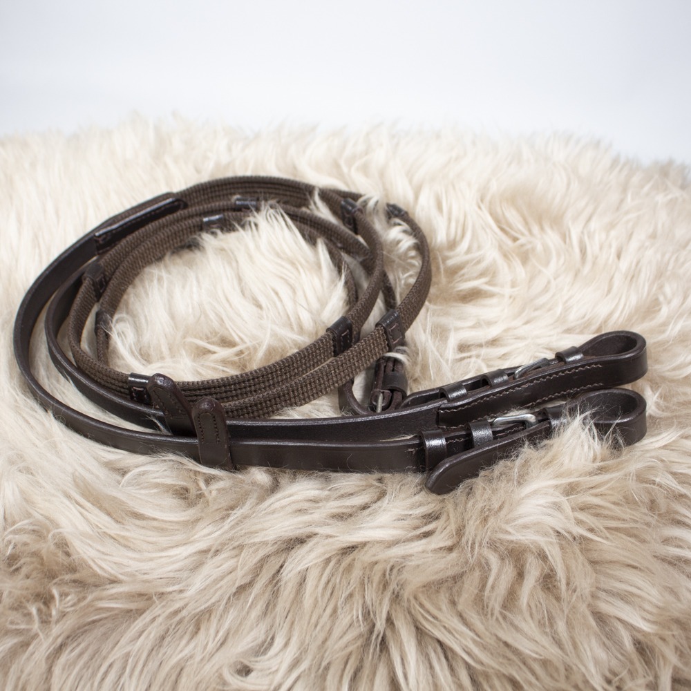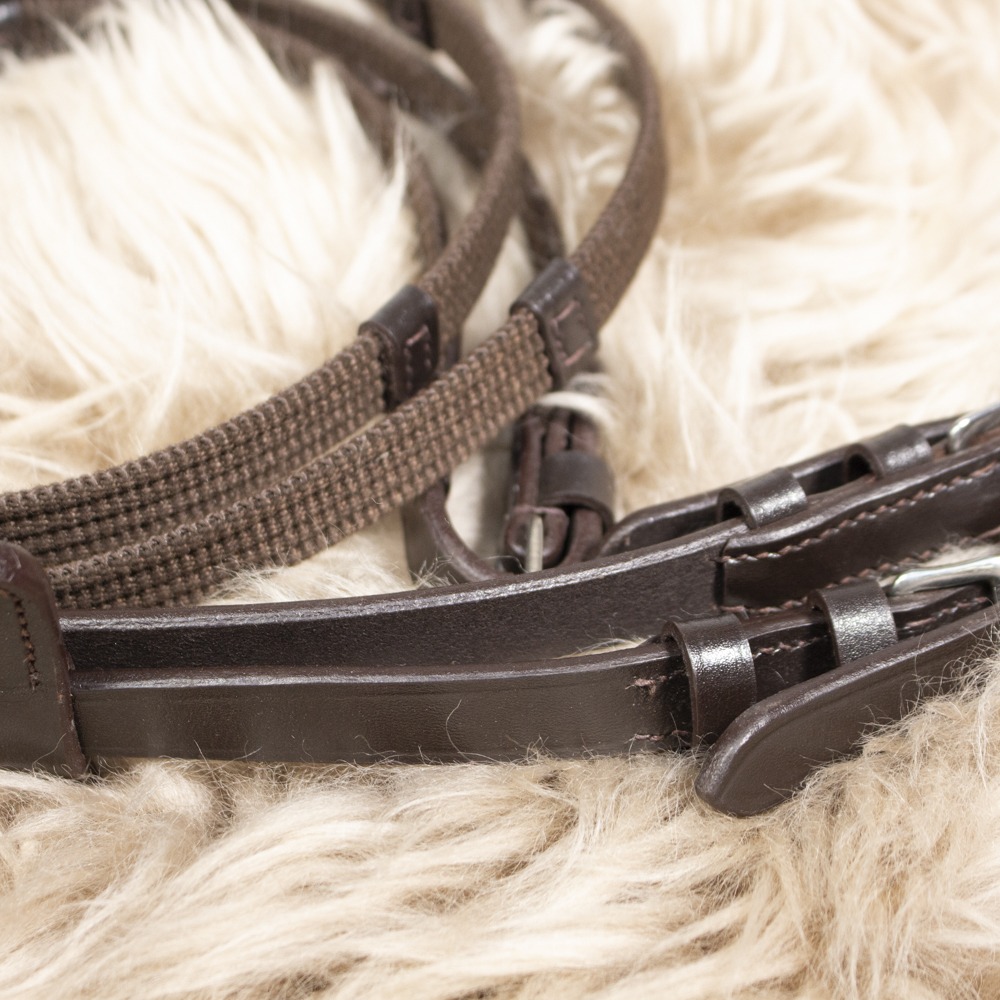 Die Gurtzügel von Hans Melzer in braun, haben Größe Pony und silberne Beschläge. Die Zügel sind neu.