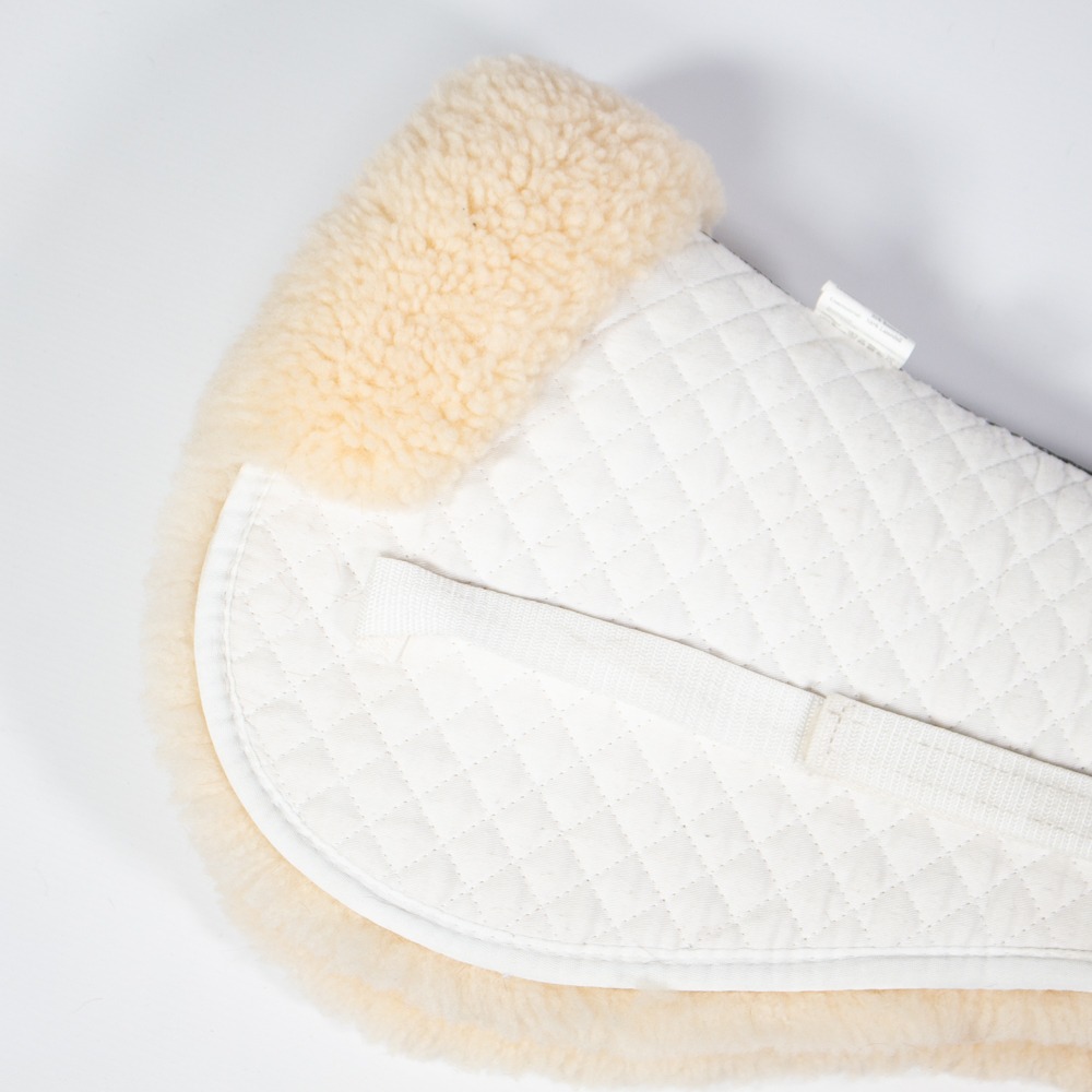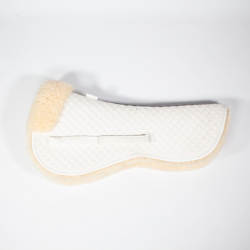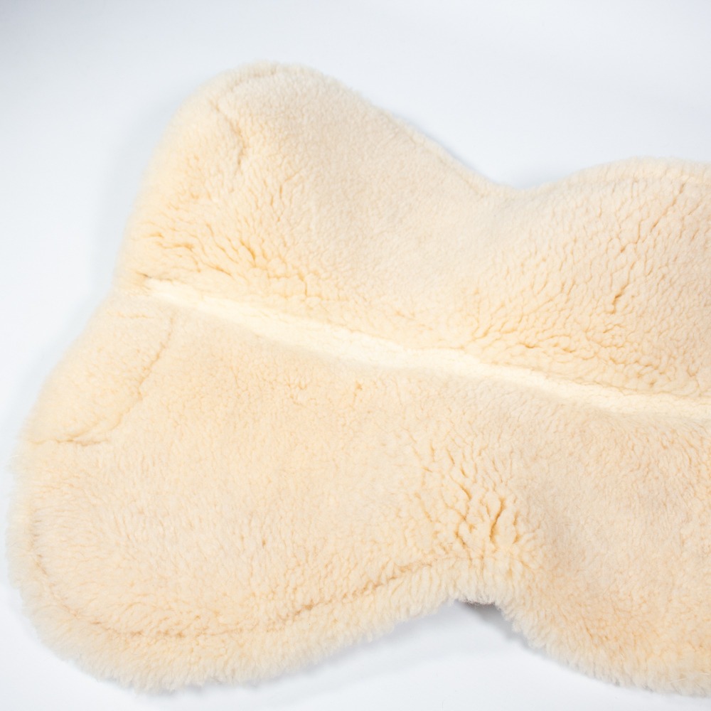 Das Sattelkissen von Loesdau hat eine Stoffoberseite und eine Unterseite aus Lammfell. Die Sattelunterlage hat vorne einen Fellrand. Es hat eine Einheitsgröße und ist weiß. Das Pad hat leichte Gebrauchsspuren.