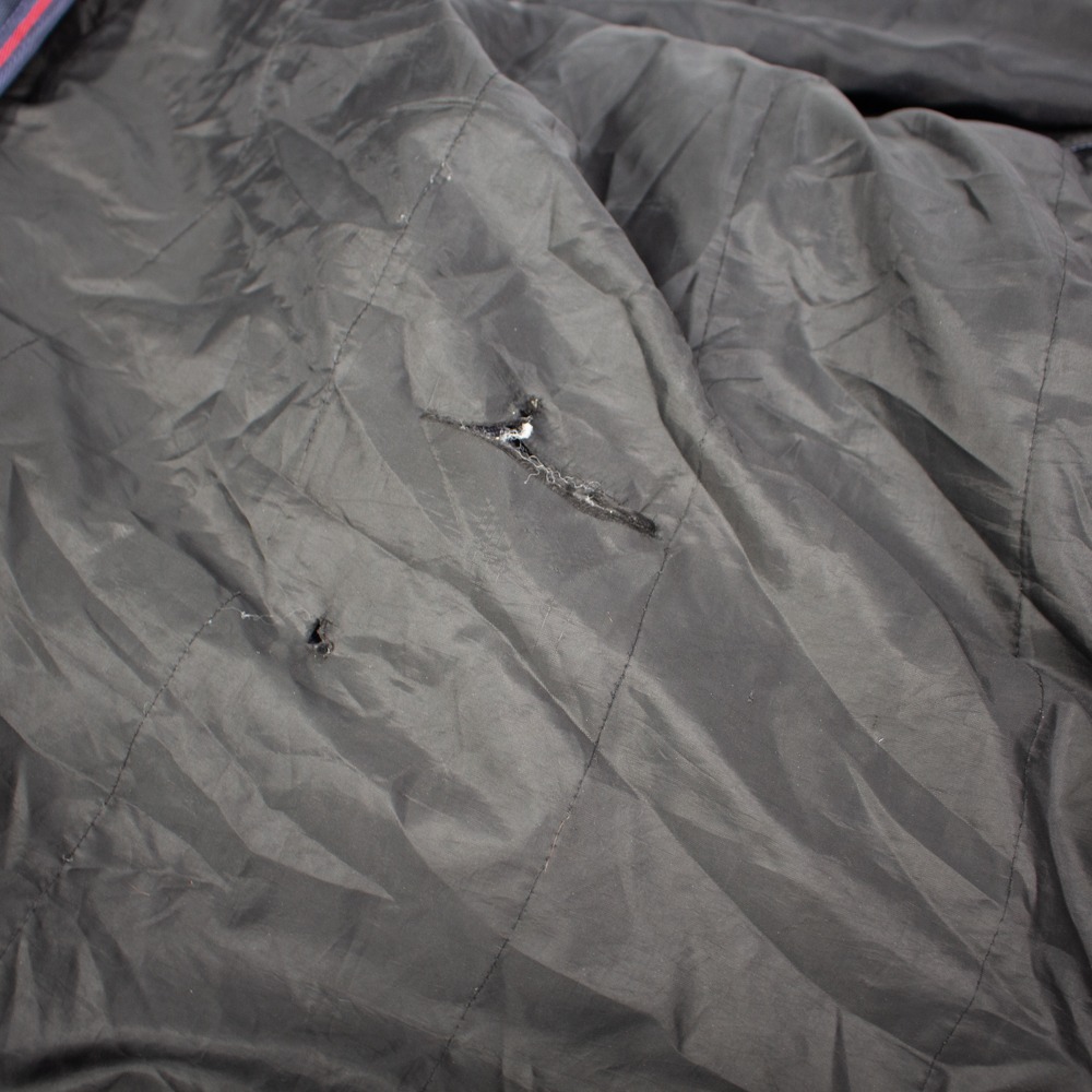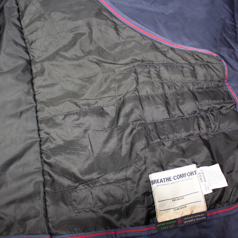 Die Outdoordecke von Horse Guard hat eine Rückenlänge von 145 cm und eine 100g Füllung. Sie hat eine Kreuzbegurtung, Gehfalten, Beingurte, einen Schweiflatz und einen Schweifriemen. Ein Beingurt fehlt. Die Decke hat leichte Gebrauchsspuren.