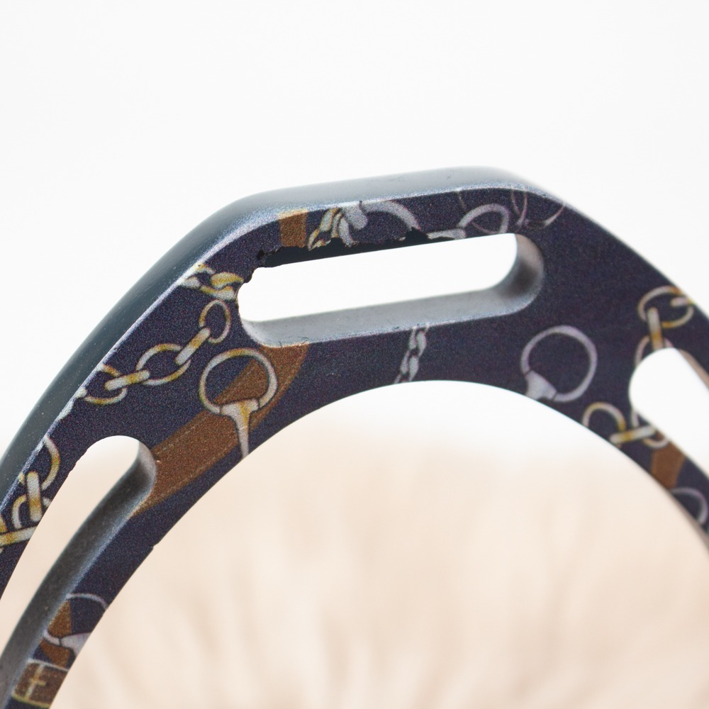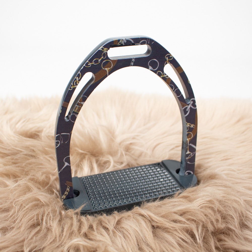 Die Steigbügel von Horze haben ein Muster und sind dunkelblau. Die Trittfläche ist 12 cm lang und 6 cm tief. Sie sind neu.