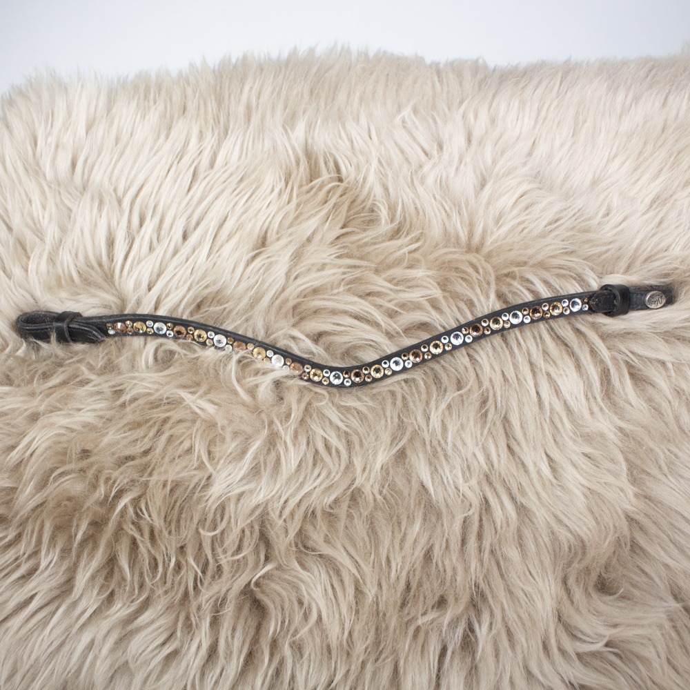 Der Stirnriemen von JFF ist aus schwarzem Leder gefertigt und geschwungen geschnitten. Das Stirnband hat Größe Warmblut. Der Stirnriemen hat leichte Gebrauchsspuren.
