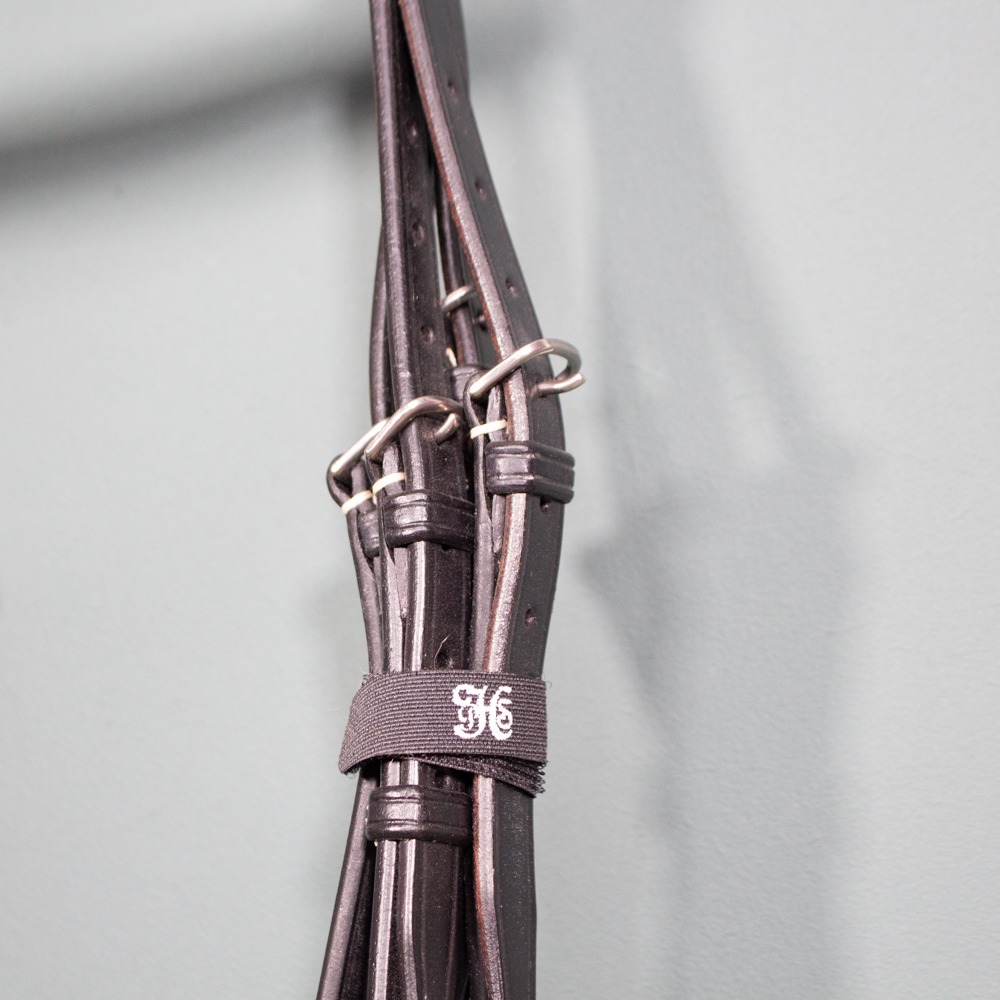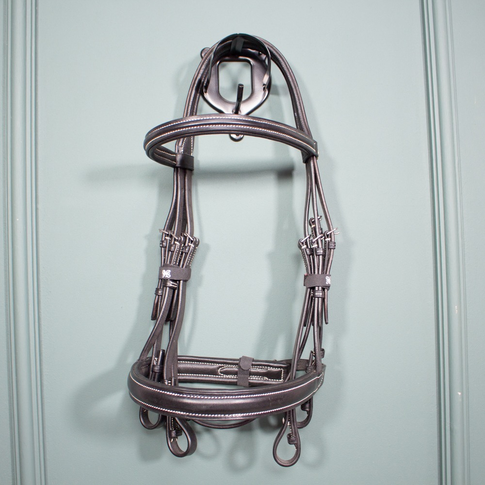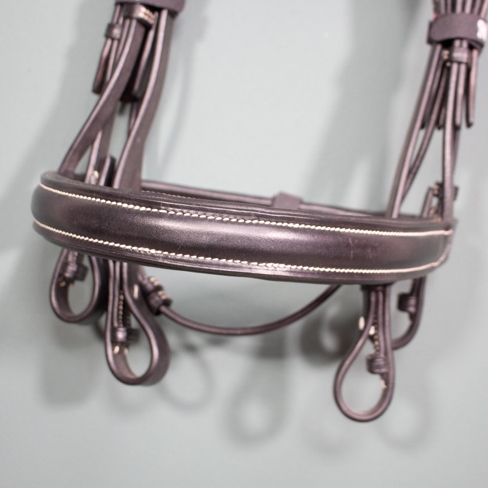 Der englische Kandarenzaum hat Größe Warmblut und ist aus Leder gefertigt. Er hat helle Kontrastnähte, ist schwarz und weich unterlegt. Er ist anatomisch geschnitten und hat silberne Beschläge. Er wird mit einem Paar Kandarenzügeln geliefert. Die Kandare ist so gut wie neu.