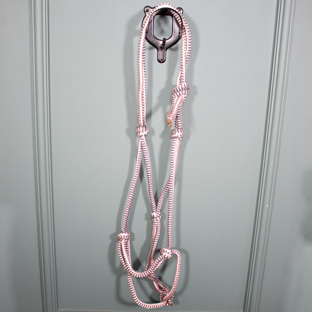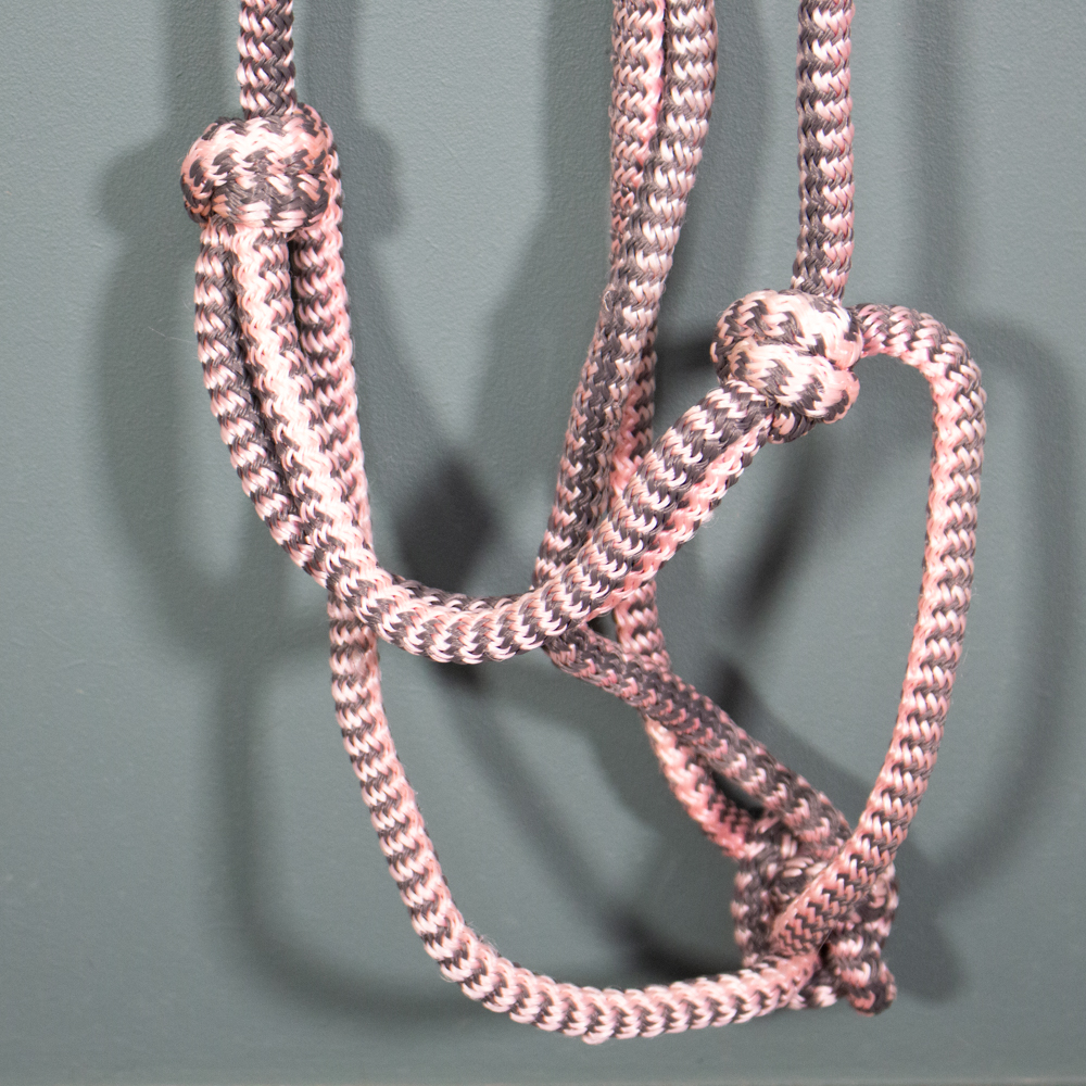 Das Knotenhalfter ist rosa und hat Größe Warmblut. Das Halfter hat leichte Gebrauchsspuren.