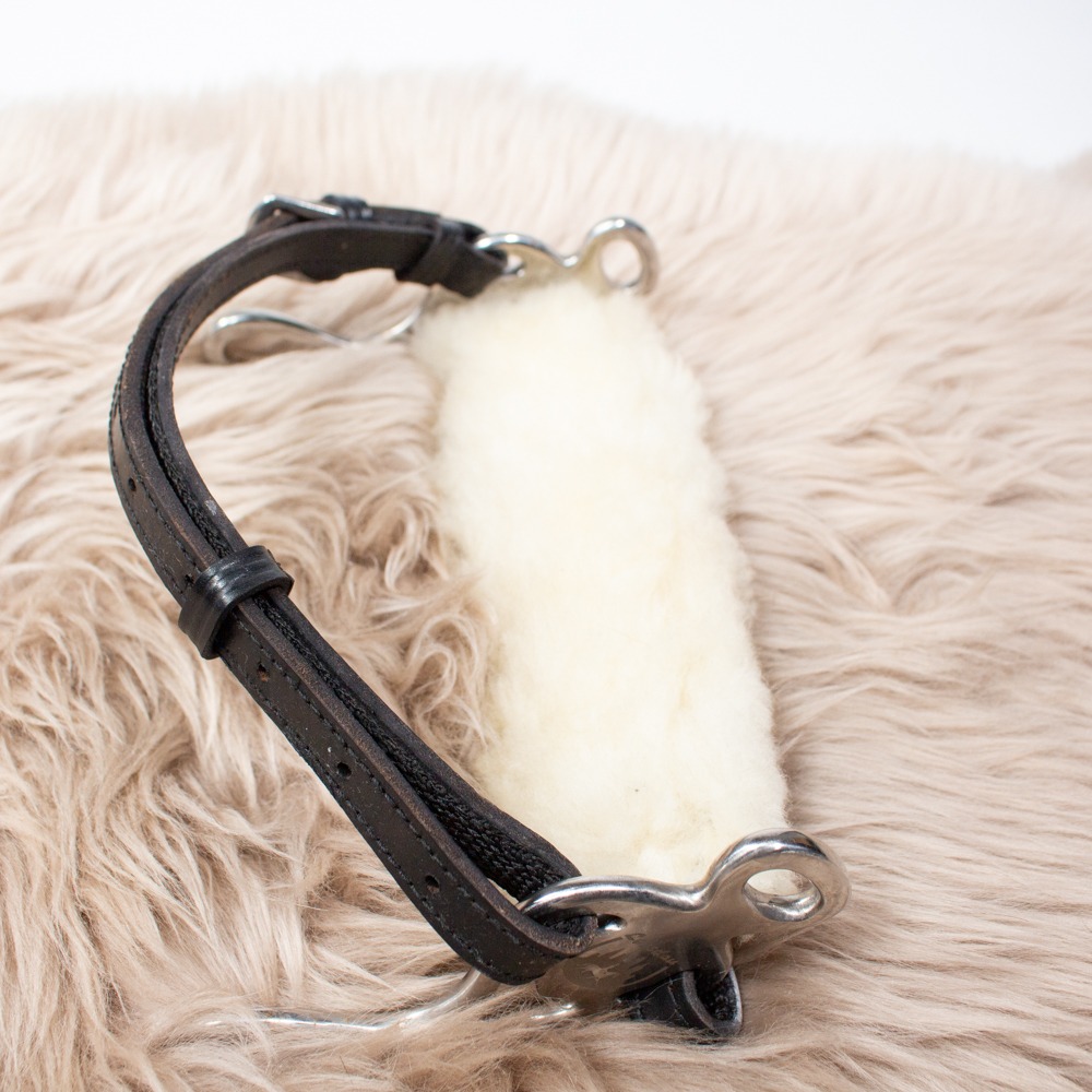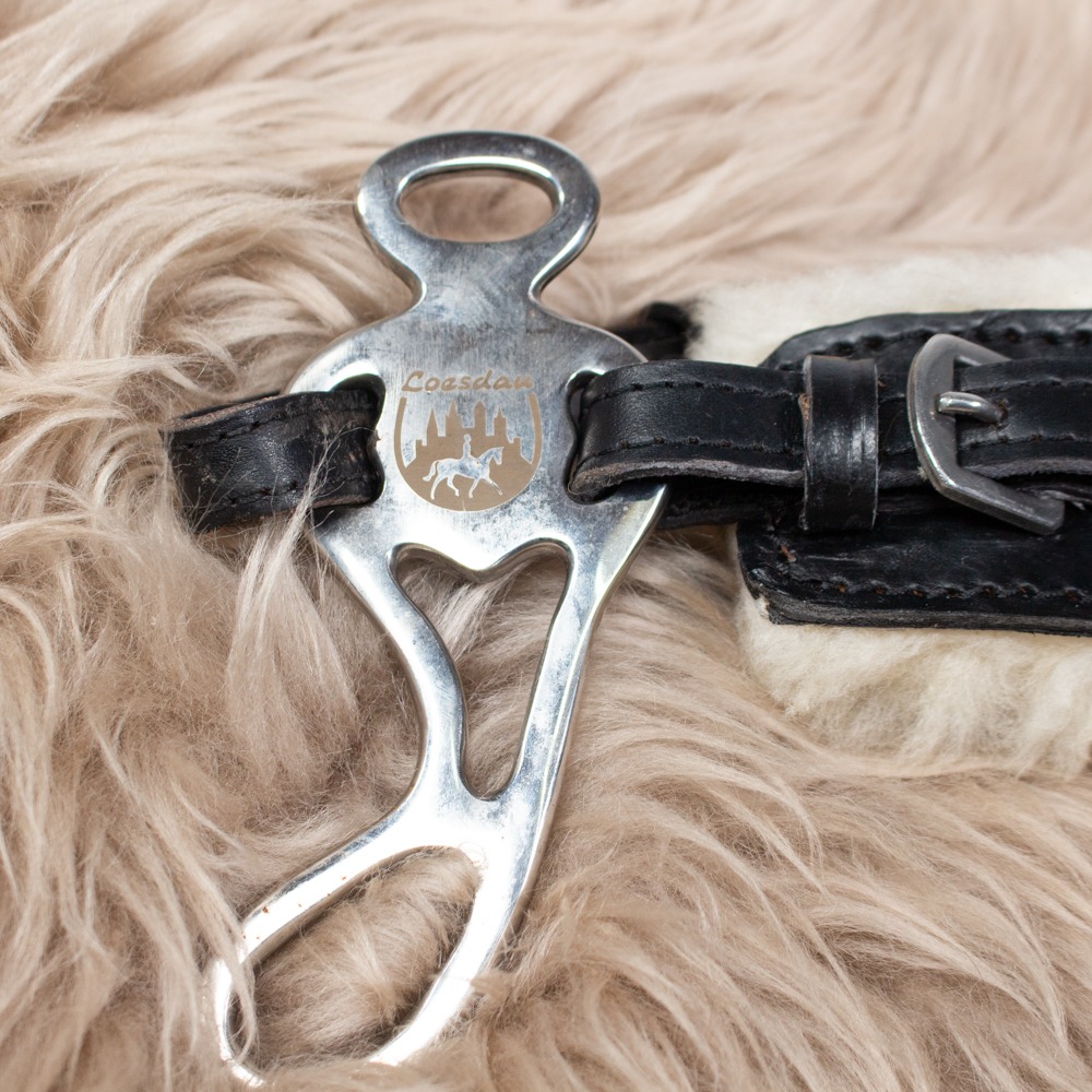Das Hackamore mit Lammfellpolster von Loesdau ist eine gebisslose Zäumung mit Nasenriemen aus robustem Leder, weicher Polsterung aus Lammfell und Nylonverstärkung in den Lederteilen. Der Kinnriemen dieses Hackamore ist aus Leder, die Seitenteile aus Edelstahl. Das Lederstück ist 21cm lang und 5 cm breit und die Anzüge sind 9,5 cm lang. Gebisslose und andere Zäumungen sollten immer dem Ausbildungsstand von Pferd und Reiter entsprechen. Wir empfehlen gebisslose Zäumungen nur Reitern, die einen vom Zügel unabhängigen Sitz beherrschen. Darüber hinaus sollte sie nur in Reithallen oder eingezäunten Bereichen Anwendung finden. Bitte die StVO beachten. Es hat leichte Gebrauchsspuren.