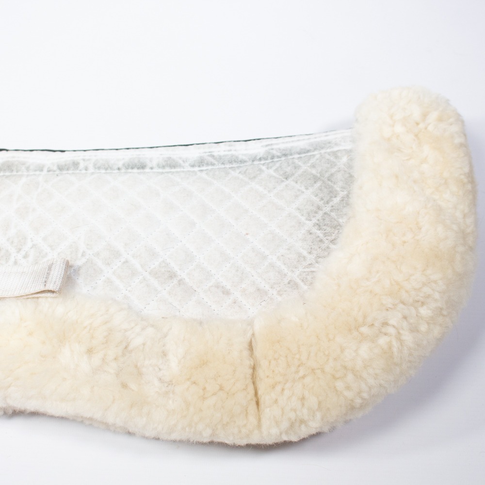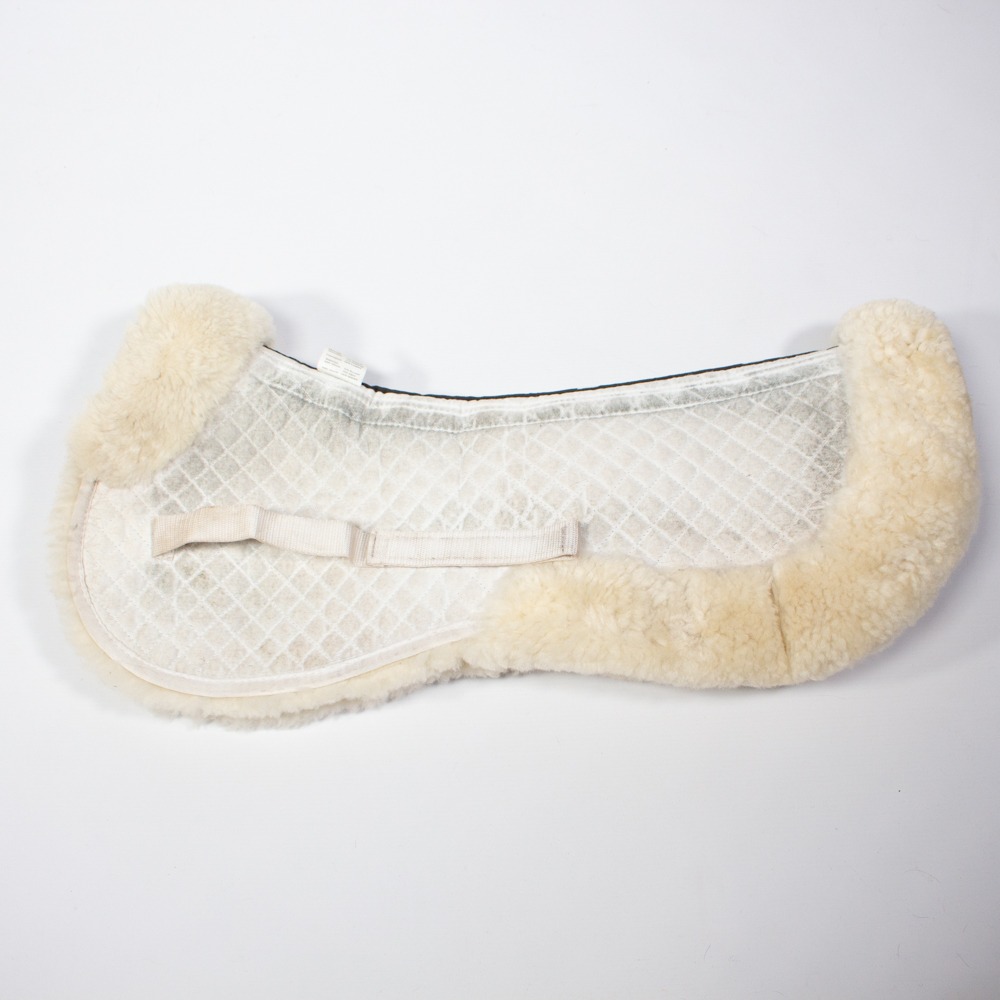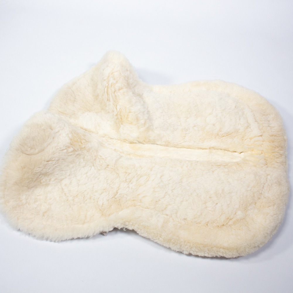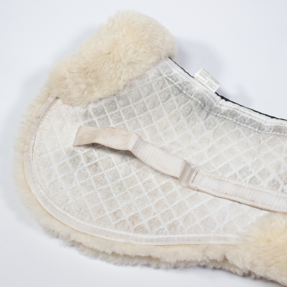 Das Sattelkissen von Loesdau hat eine Stoffoberseite und eine Unterseite aus Lammfell. Die Sattelunterlage hat vorne und hinten einen Fellrand. Es hat Einschubtaschen für Polster. Es hat eine Einheitsgröße und ist weiß. Das Pad hat Gebrauchsspuren.