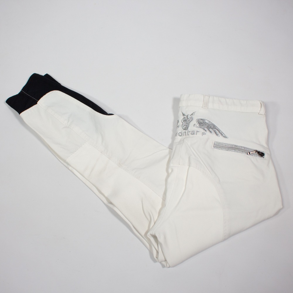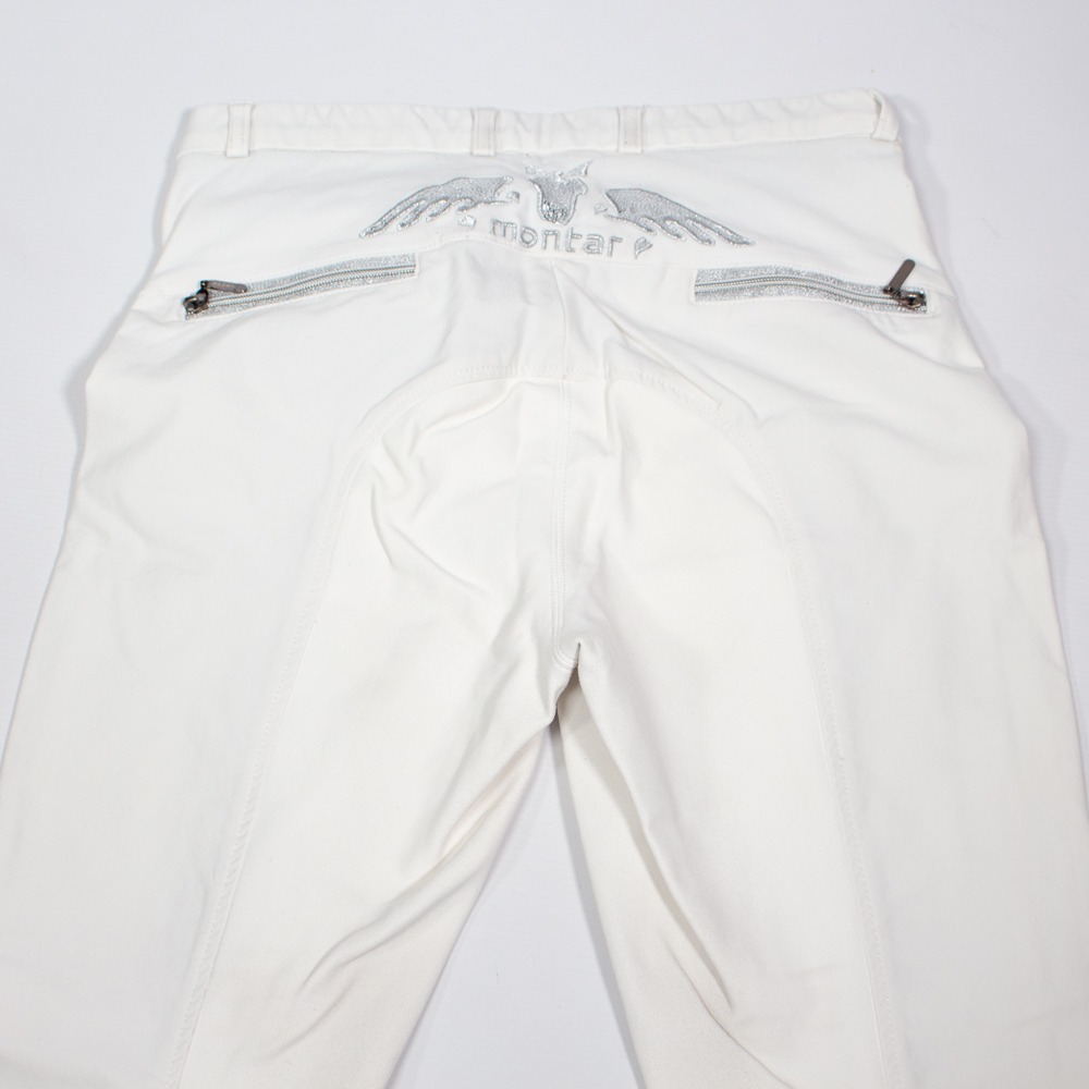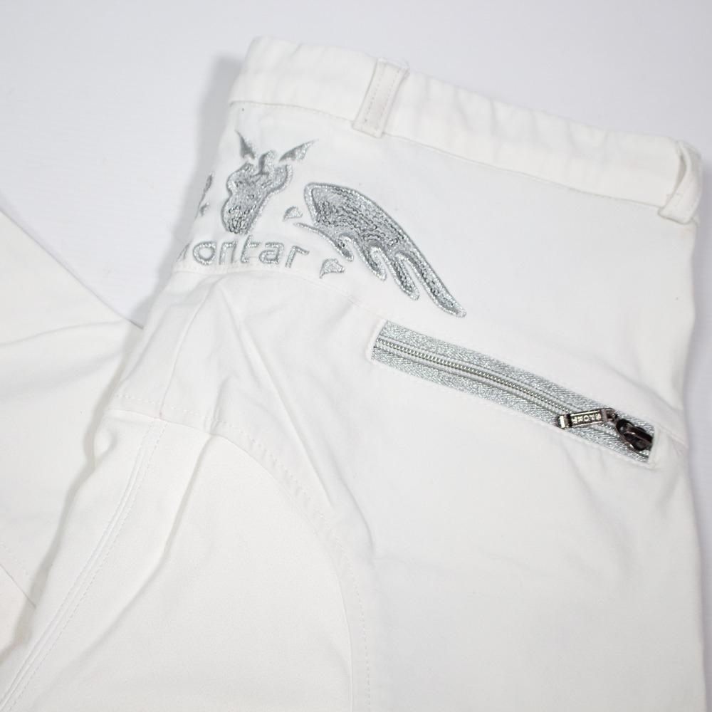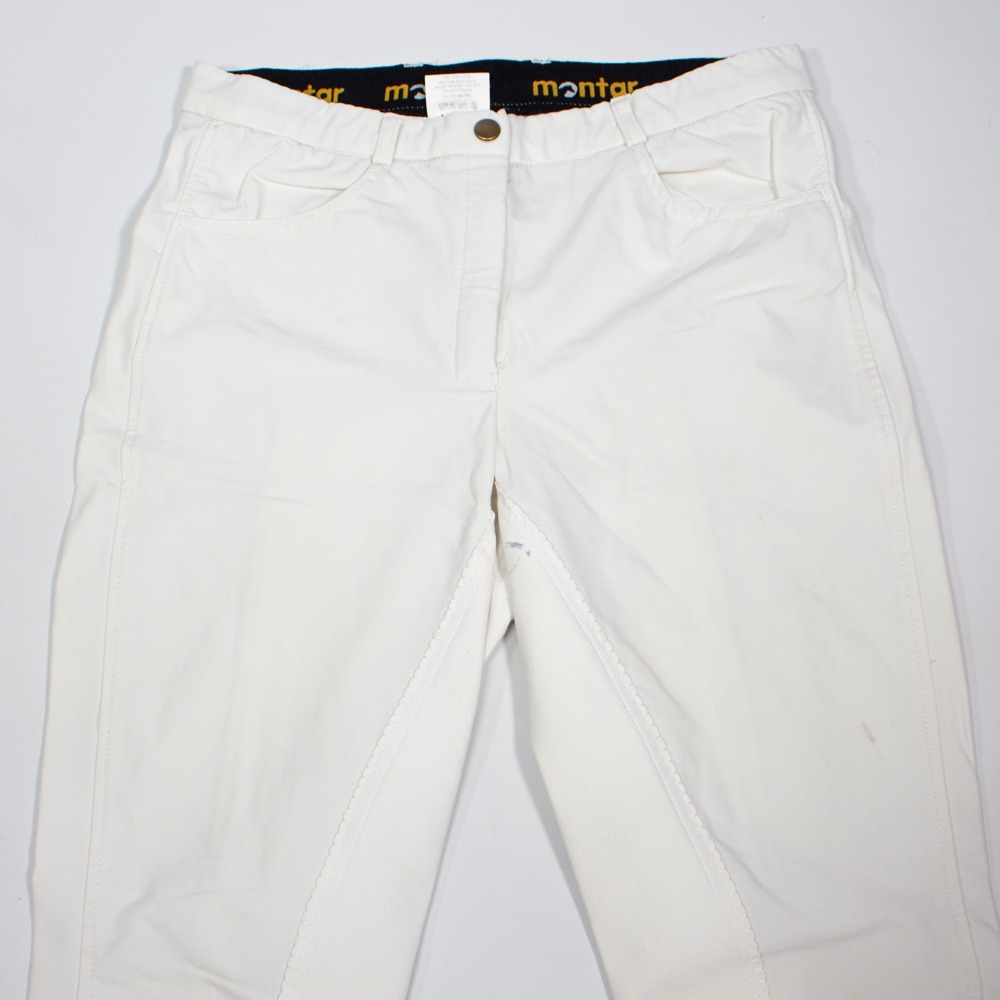 Die Reithose von Montar ist weiß und hat Größe 40. Die Hose hat einen Vollbesatz. Die Hose hat leichte Gebrauchsspuren.