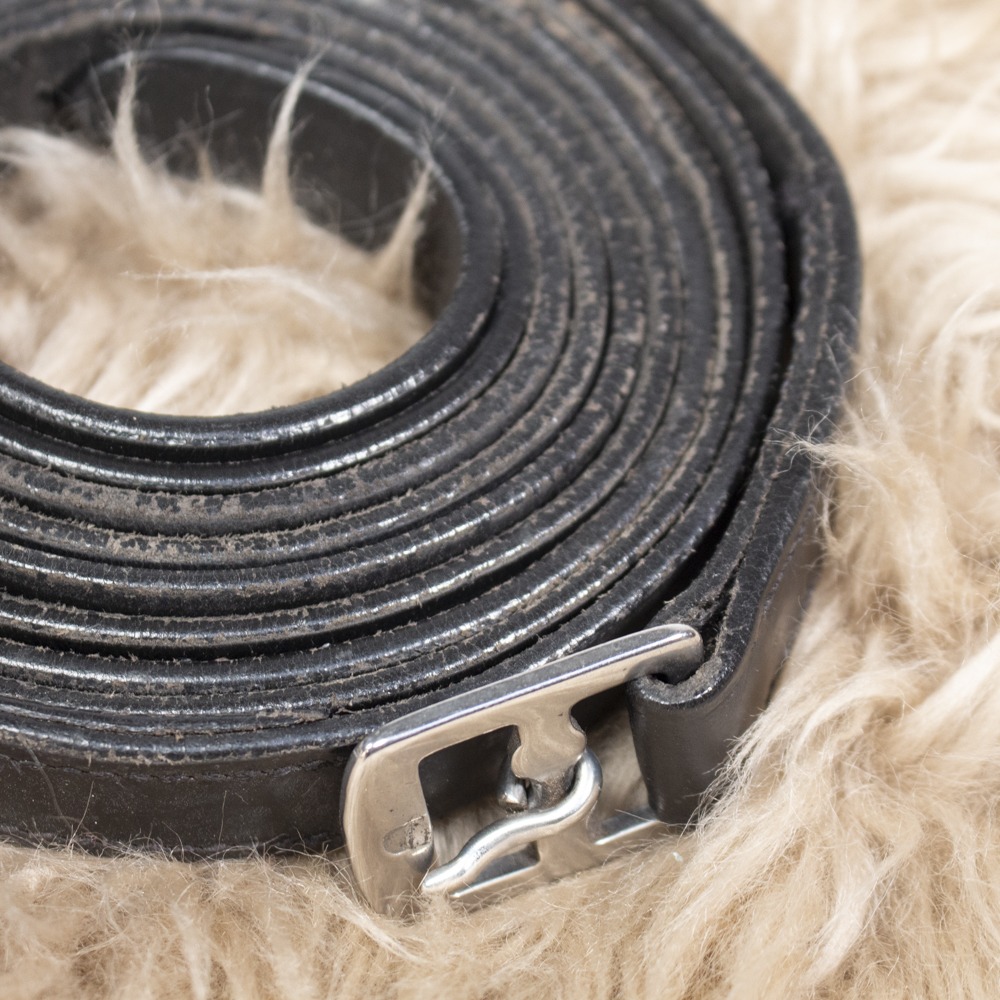 Die Steigbügelriemen von Passier sind 160 cm lang. Sie sind aus Leder gefertigt und schwarz. Sie werden paarweise geliefert. Die Riemen haben Gebrauchsspuren und eine beschädigte Stelle.