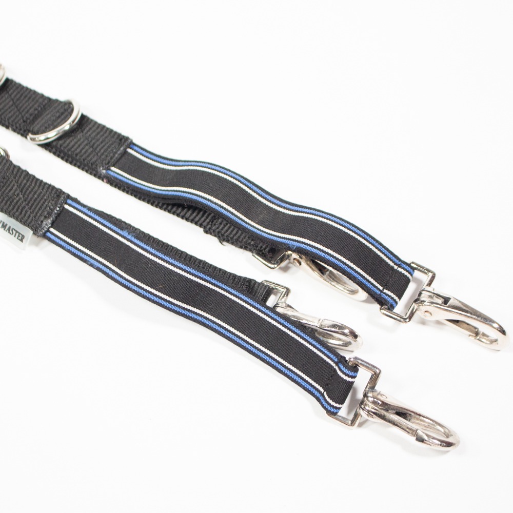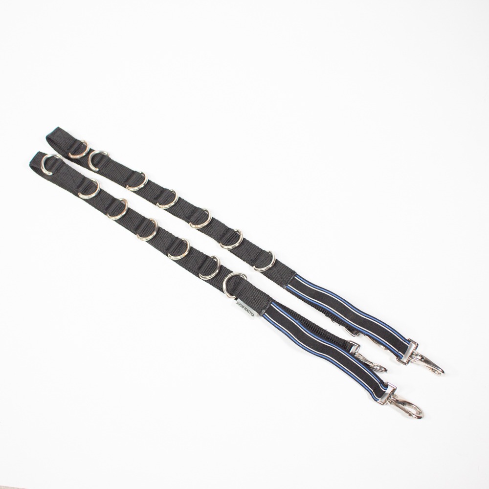 Die Ausbinder von Showmaster sind aus Nylon, schwarz und haben Größe Warmblut. Die Hilfszügel haben Gebrauchsspuren.