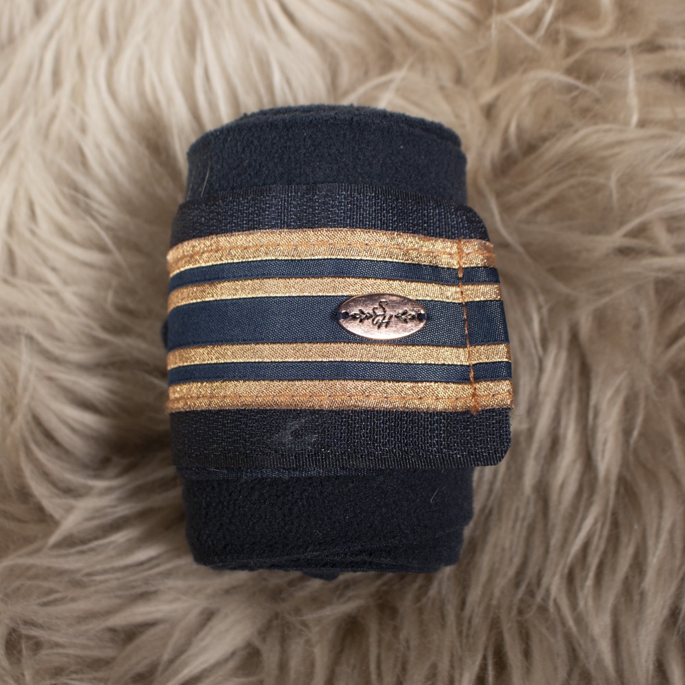 Die Bandagen von Showmaster in Größe Warmblut sind dunkelblau und kommen im 2er Set. Die Bandagen haben leichte Gebrauchsspuren und sind gekürzt.