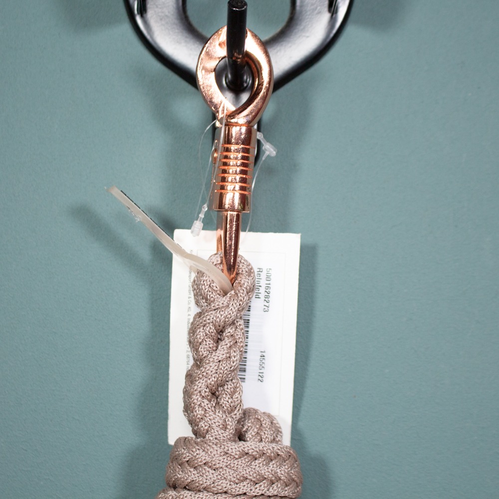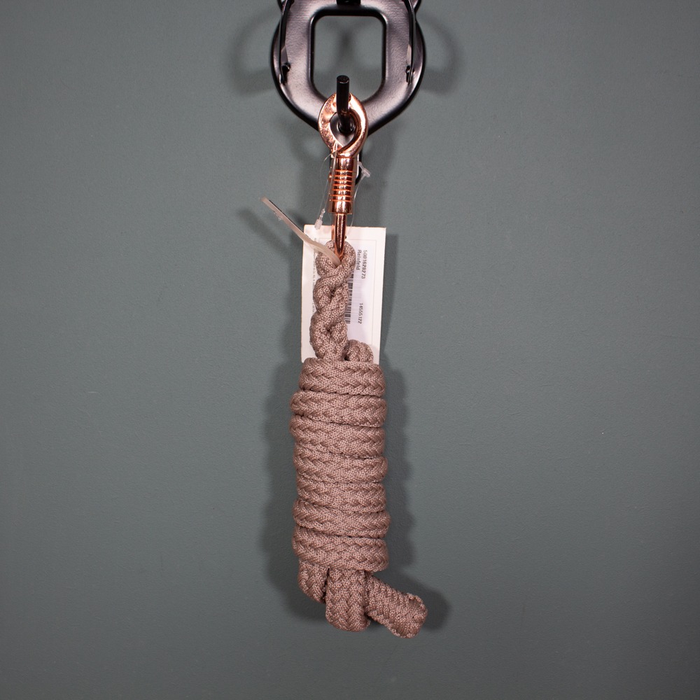 Der braune Führstrick von Showmaster hat einen roségoldenen Panikhaken. Er ist neu.