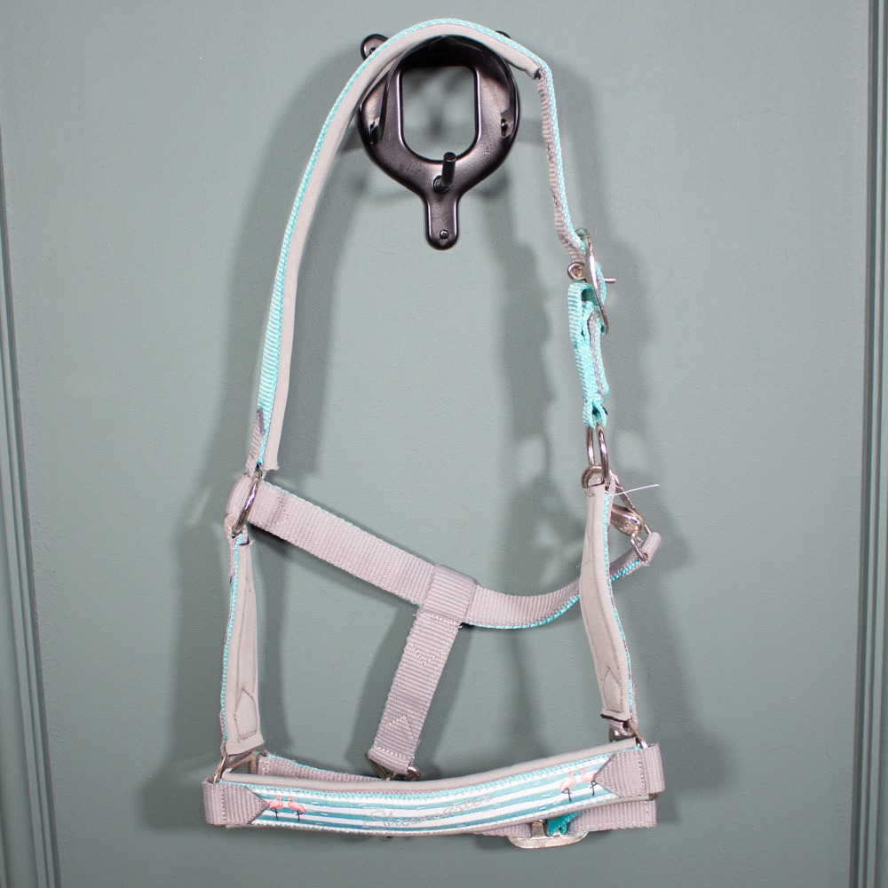 Das Halfter von Showmaster ist türkis und hat Größe Pony. Es hat leichte Gebrauchsspuren.