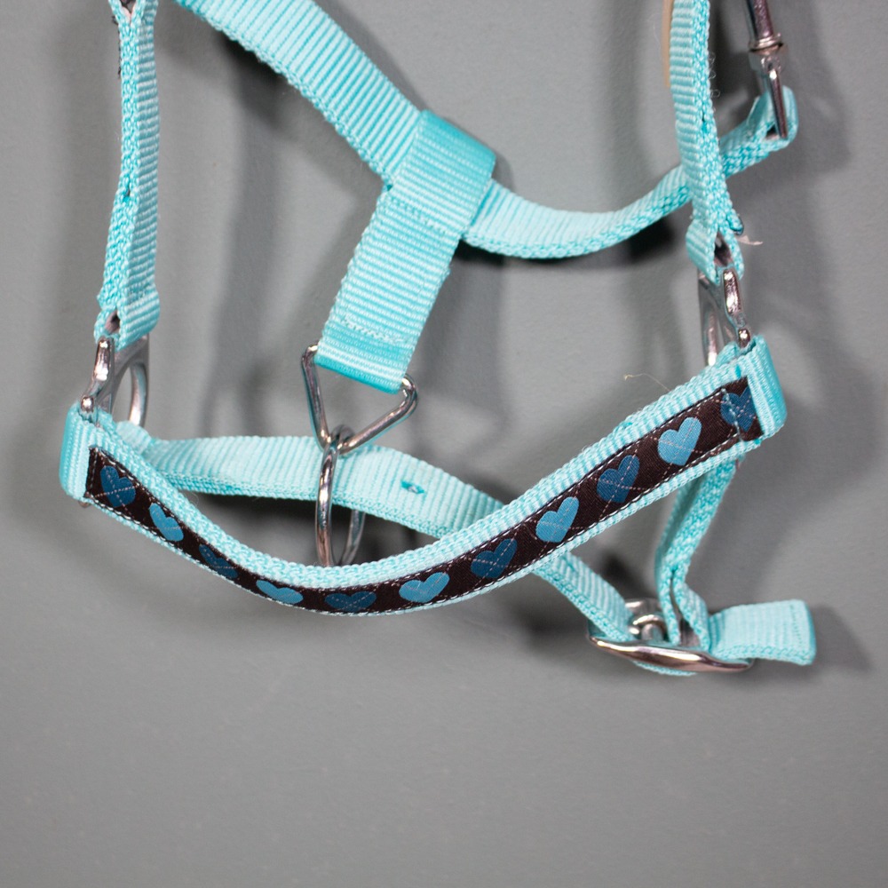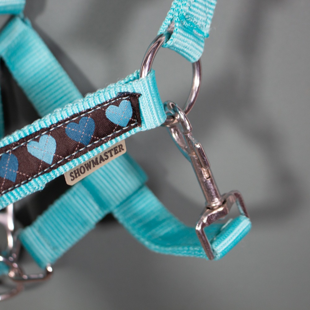 Das Halfter von Showmaster ist verstellbar am Nasen- & Genickriemen und hat Größe Shetty. Das türkise Halfter hat silberne Beschläge. Es hat leichte Gebrauchsspuren.