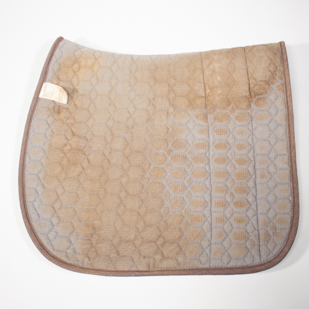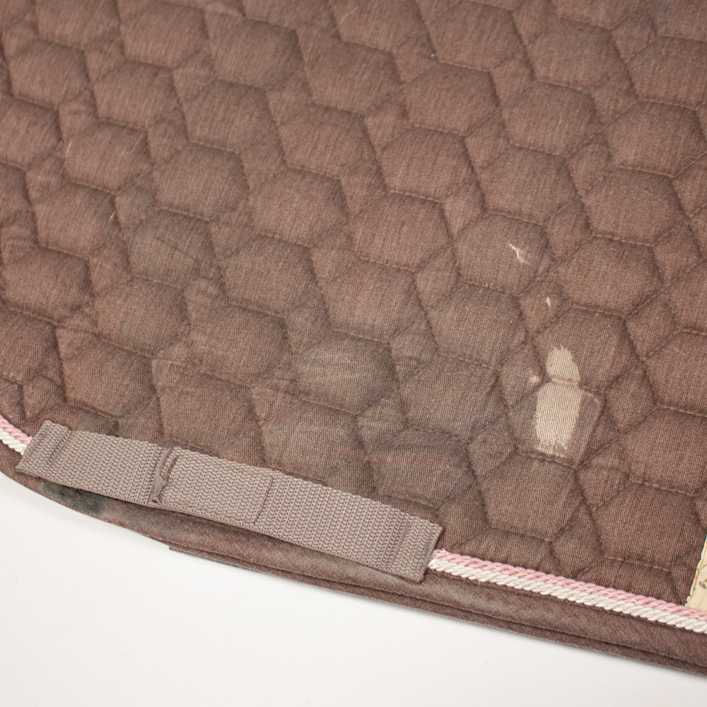 Die Schabracke von Showmaster ist braun und hat eine kleine Steppung. Sie hat eine Waffel Unterseite. Die Schabracke hat Gebrauchsspuren.