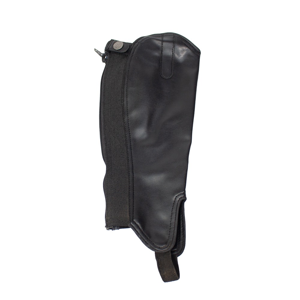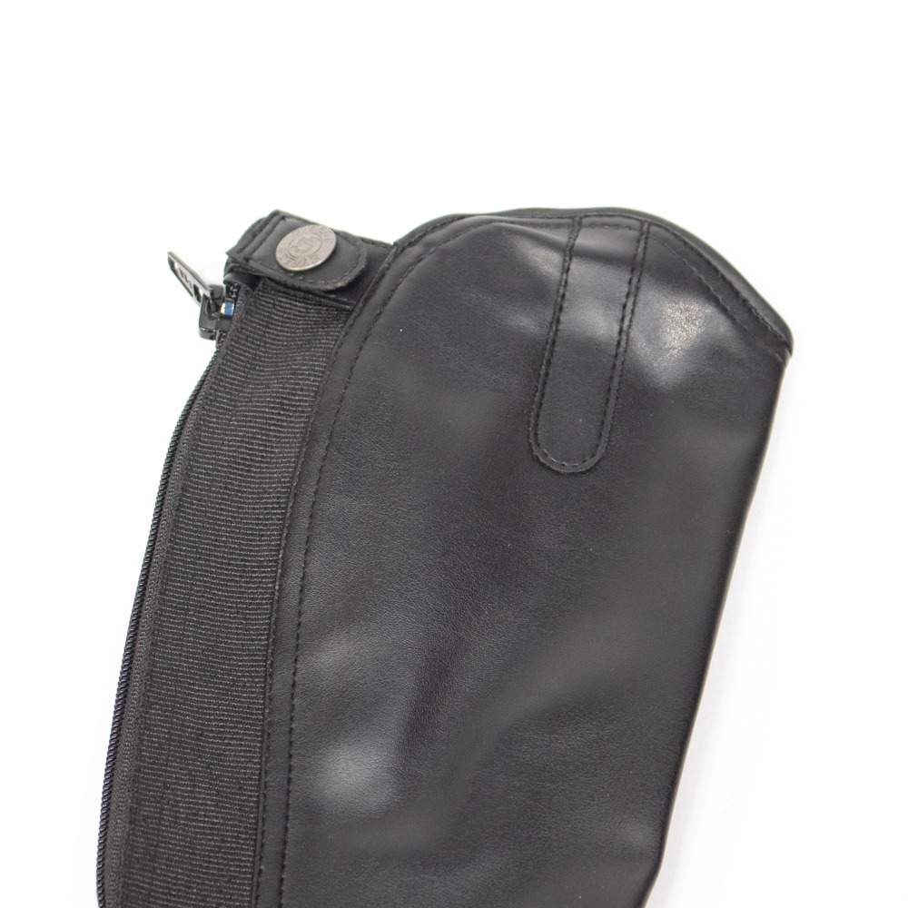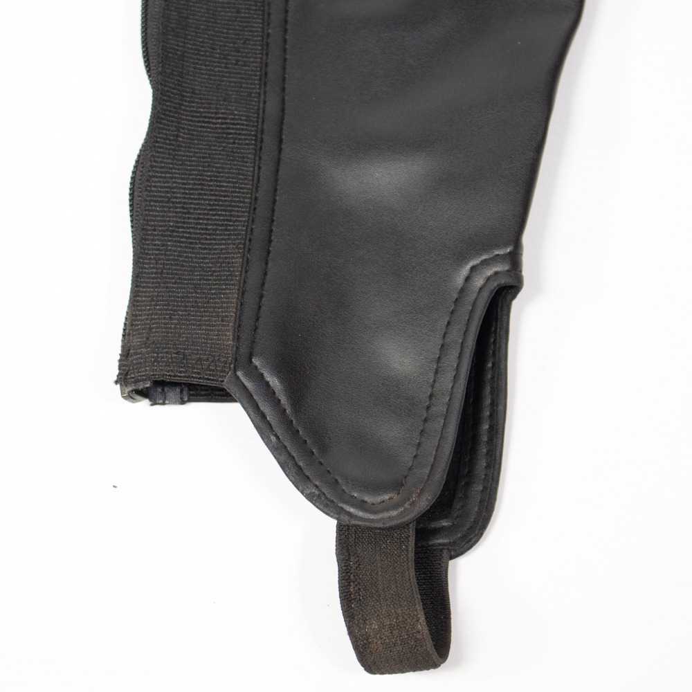Die Chaps von Steeds haben einen Reißverschluss, bestehen aus Kunstleder und sind schwarz. Sie haben einen elastischen Sohlenriemen. Sie sind 33 cm hoch und 30 cm weit. Die Chaps haben leichte Gebrauchsspuren.