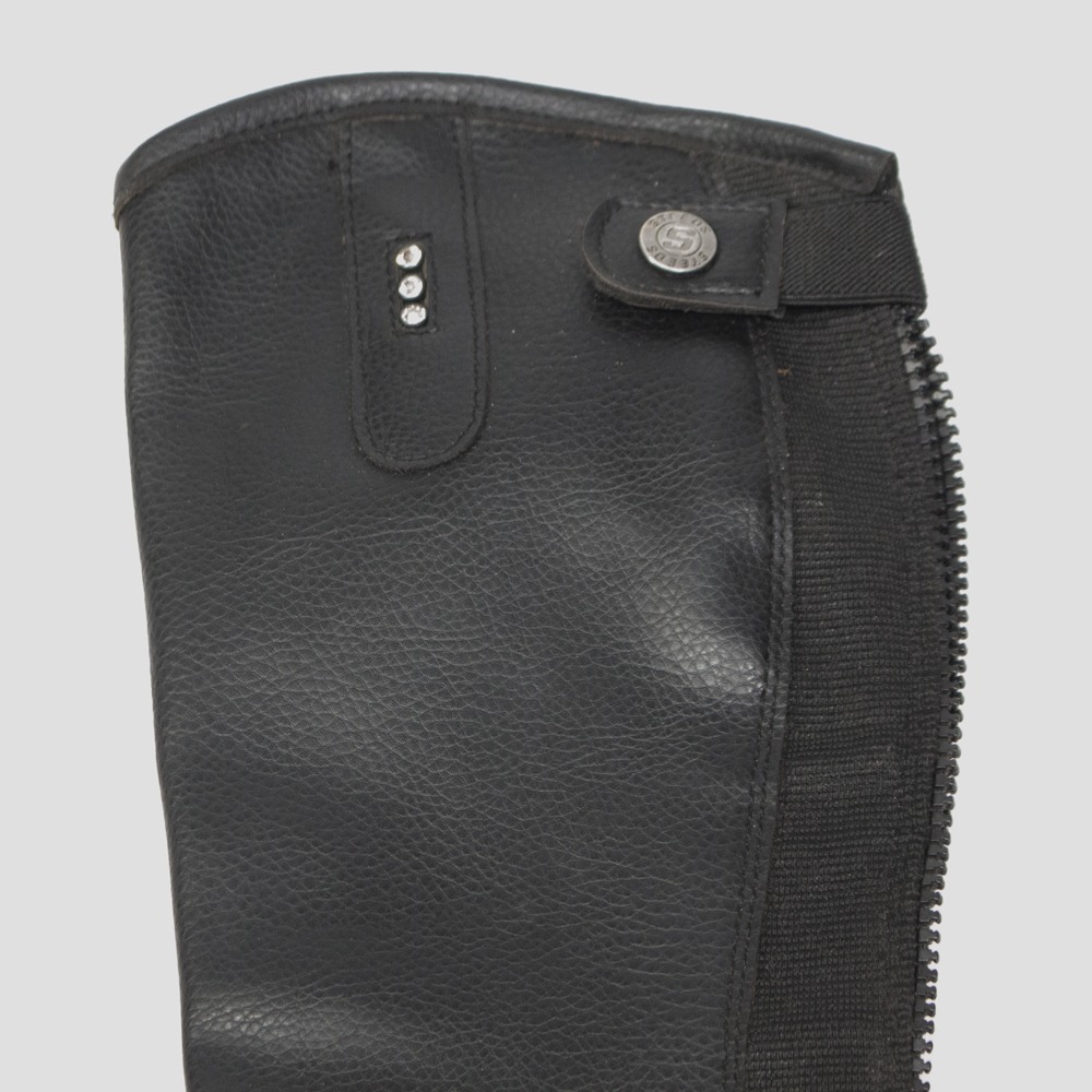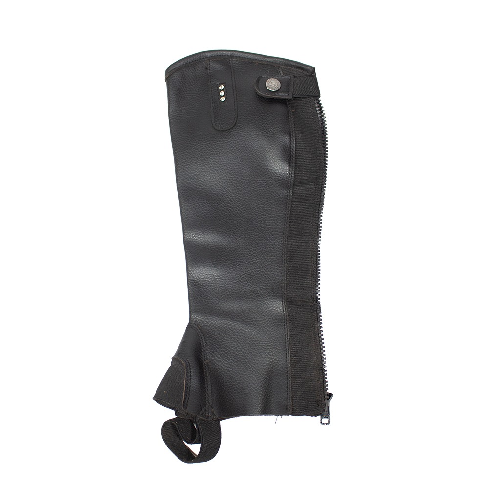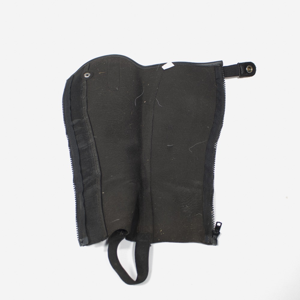 Die Chaps von Steeds haben einen Reißverschluss und sind schwarz. Sie haben einen elastischen Sohlenriemen. Sie sind 37 cm hoch und 32 cm weit. Die Chaps haben leichte Gebrauchsspuren.