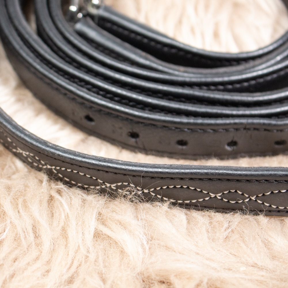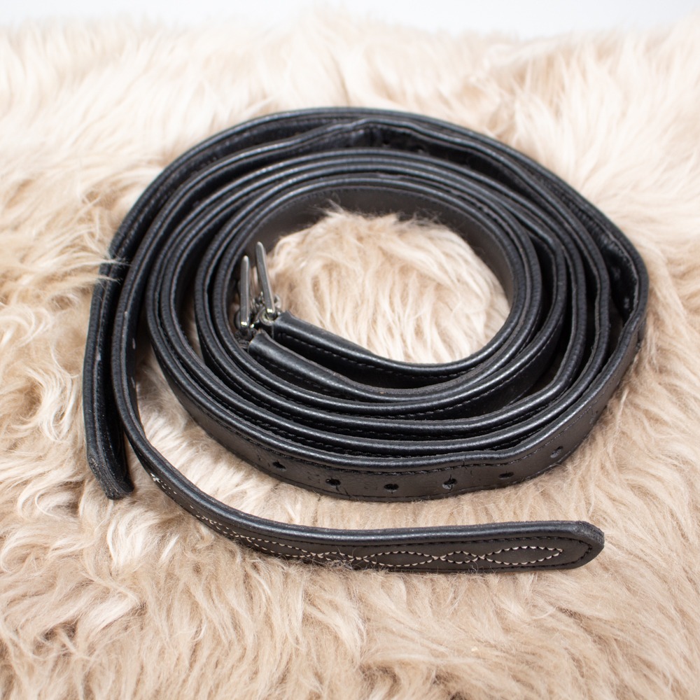 Die Steigbügelriemen sind 155 cm lang. Sie sind aus Leder gefertigt und schwarz. Sie werden paarweise geliefert. Die Riemen haben leichte Gebrauchsspuren.