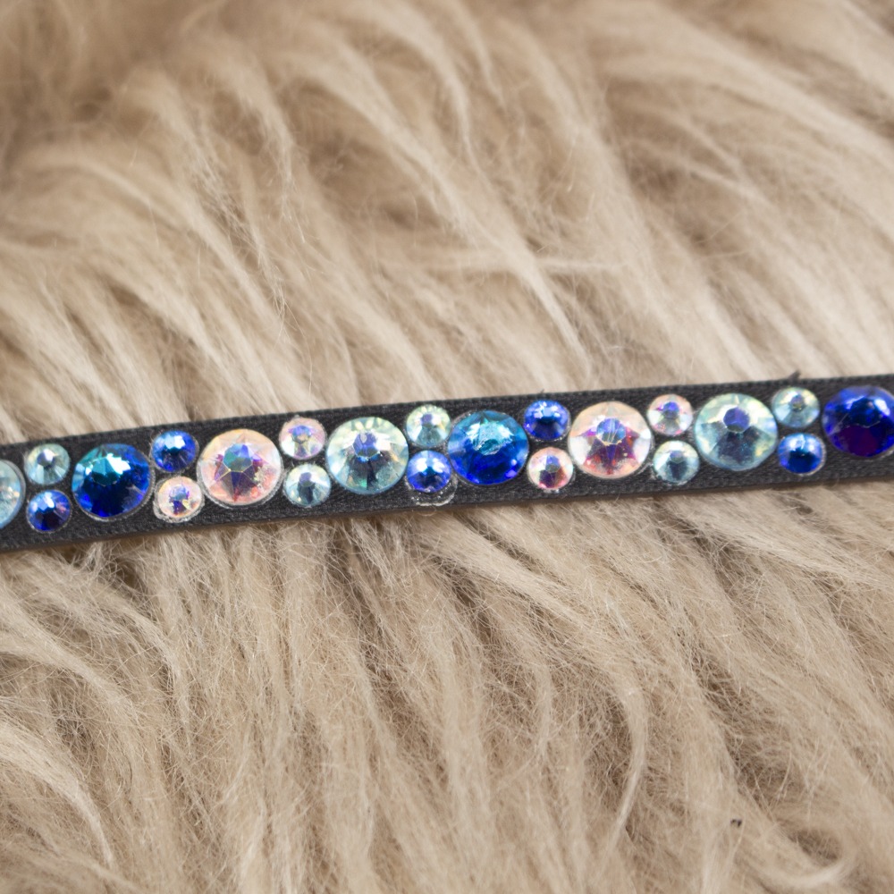 Das Inlay hat Größe Pony und bunte Glitzersteine. Der Stirnriemen hat leichte Gebrauchsspuren.