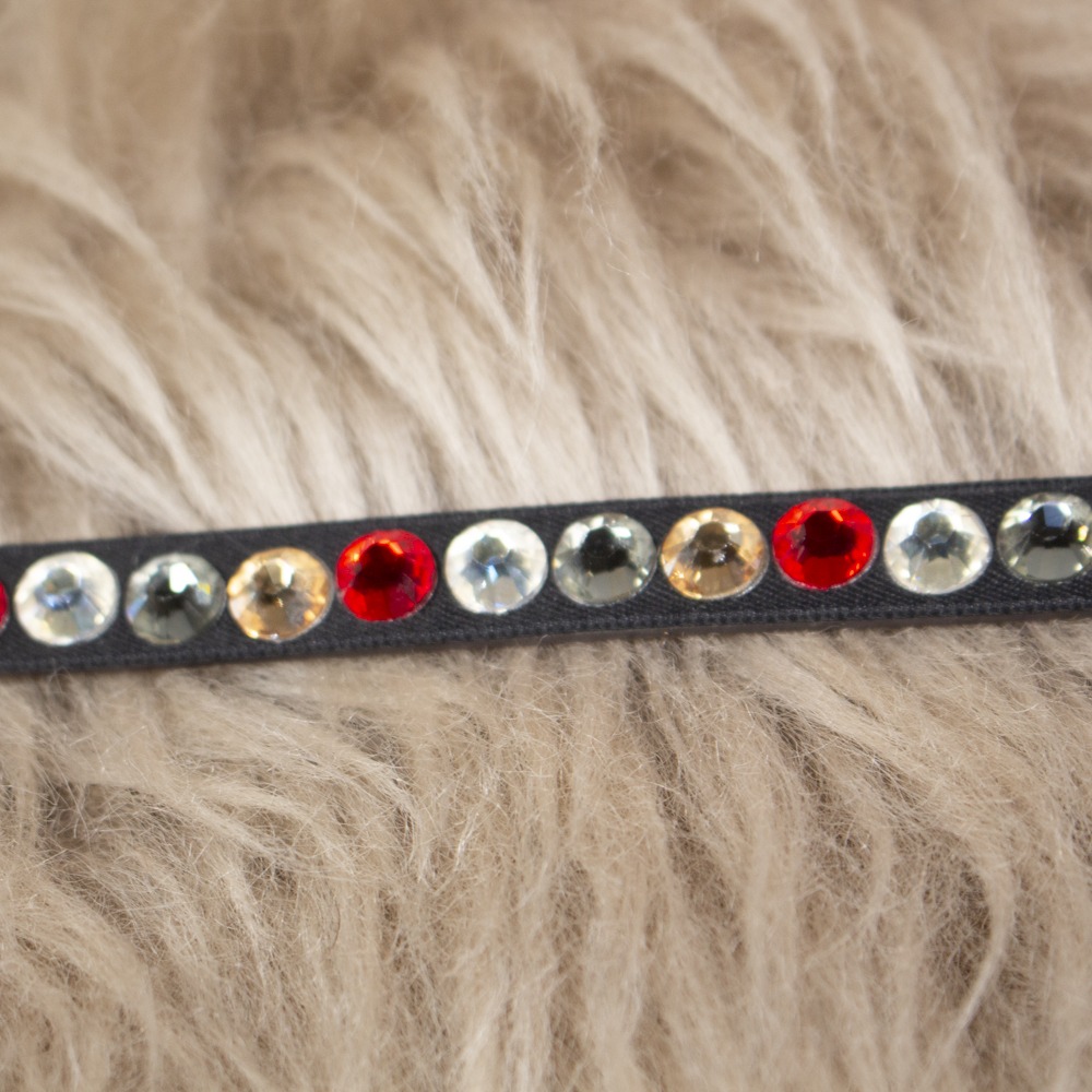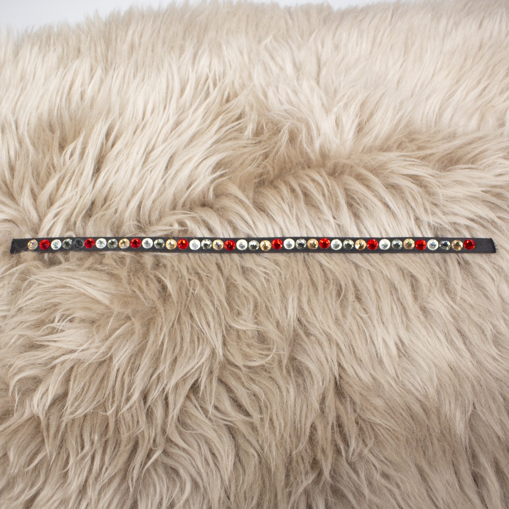 Das Inlay hat Größe Pony und rote Glitzersteine. Der Stirnriemen hat leichte Gebrauchsspuren.